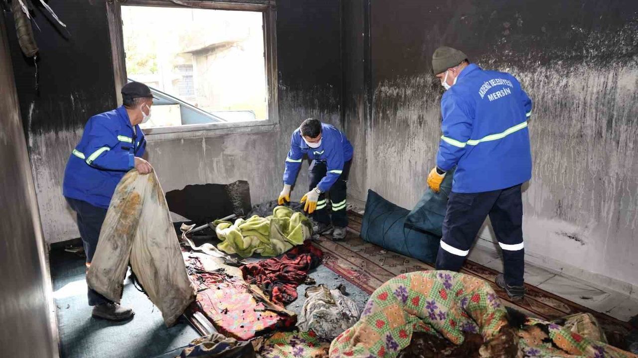 Mersin'in Akdeniz ilçesine bağlı Güneş Mahallesi'nde meydana gelen yangında zarar gören ev, belediye ekiplerinin yürüttüğü temizlik ve tahliye çalışmalarıyla yeniden yaşanabilir hale getirilmeye çalışıldı. Akdeniz Belediyesi Çevre Koruma ve Kontrol Müdürlüğü ekipleri, yangının ardından hızlı bir şekilde bölgeye intikal ederek kullanılamaz hale gelen eşyaları titizlikle tahliye etti. Dar sokaklarda manevra kabiliyeti yüksek çöp taksileriyle atıklar kısa sürede bölgeden uzaklaştırıldı.