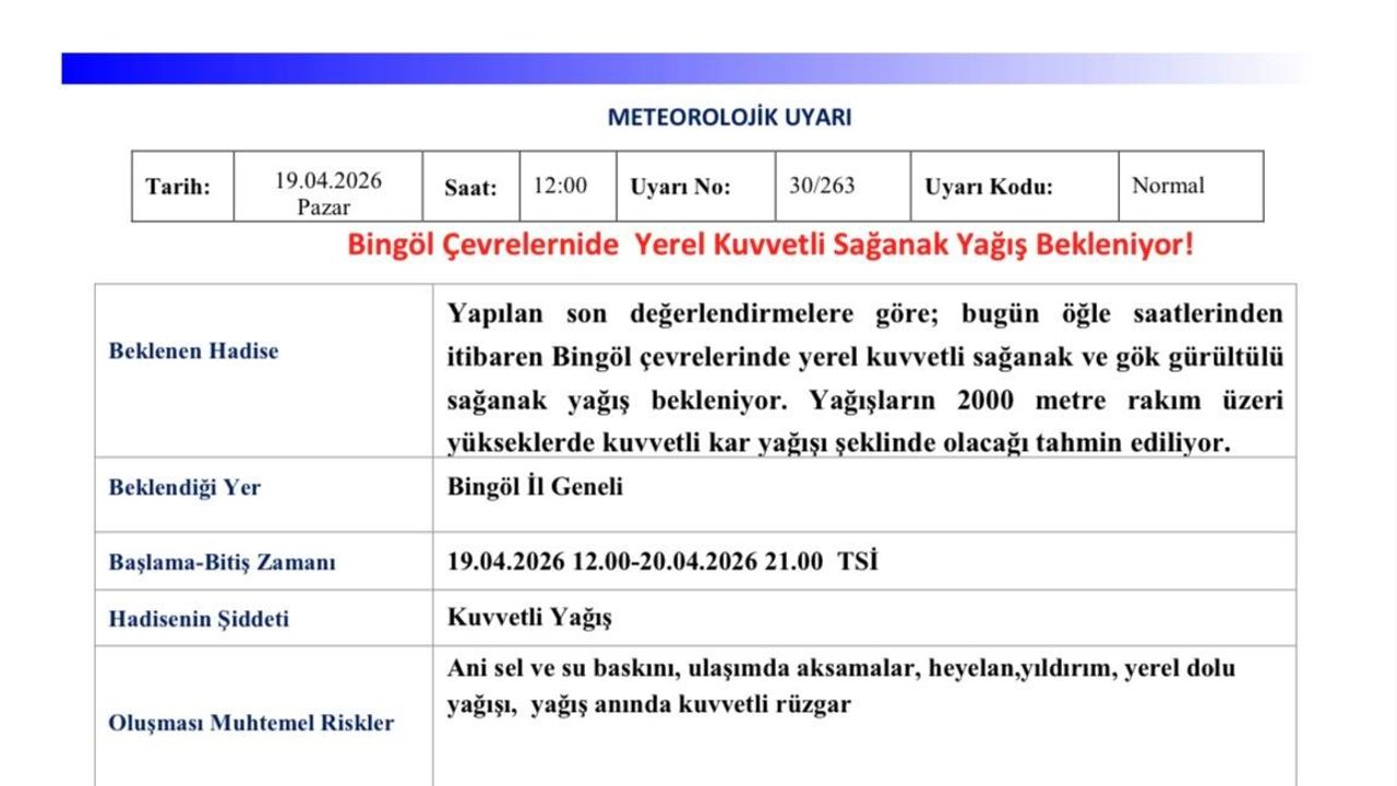 Meteoroloji, Bingöl için sağanak yağış uyarısı yaptı. Meteoroloji 13. Bölge Müdürlüğü tarafından yapılan açıklamada, “Yapılan son değerlendirmelere göre; bugün öğle saatlerinden itibaren Bingöl çevrelerinde yerel kuvvetli sağanak ve gök gürültülü sağanak yağış bekleniyor.”