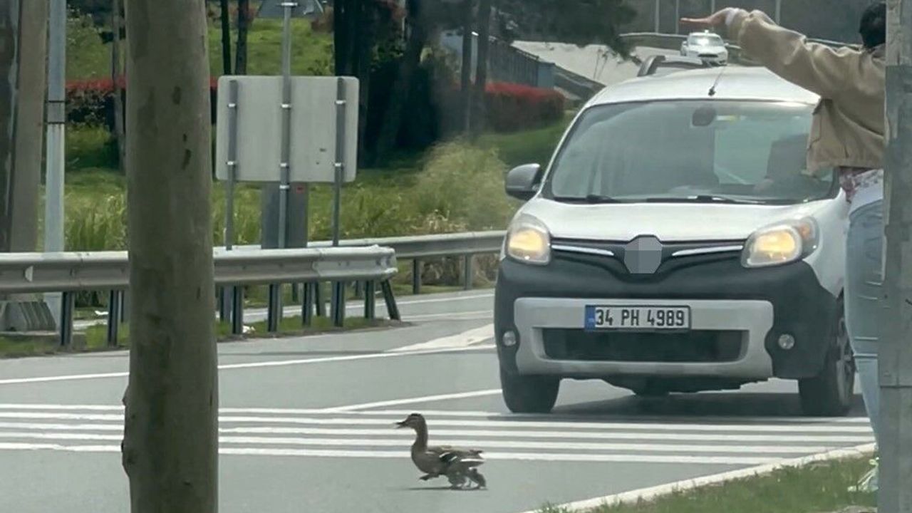 İstanbul'da bir ördek ailesinin güvenli bir şekilde karşıdan karşıya geçmesi için bir sürücü, akan trafiği durdurdu. O anlar, Sancaktepe'de başka bir vatandaşın kamerasında görüntülendi.