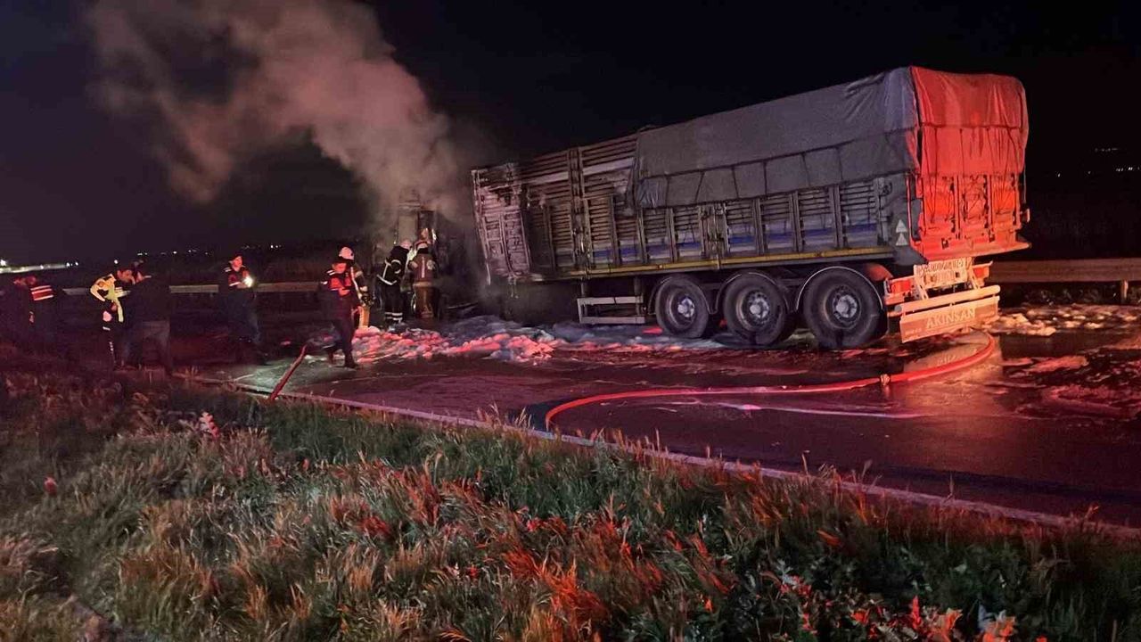 Bursa'nın Karacabey ilçesinde, Uluabat mevkiinde seyir halindeki bir tırda ani bir yangın çıktı. Olay, gece saat 00.30 civarında Karacabey-Bursa yolu üzerindeki Uluabat bölgesinde gerçekleşti. Henüz sebebi belirlenemeyen yangın, kısa sürede tırın tamamını sararak büyüdü. Alevler ve yoğun duman, yoldan geçen sürücüler tarafından cep telefonlarıyla kaydedildi. Yangın nedeniyle Karacabey-Bursa yolu geçici olarak trafiğe kapatılırken, olay yerine itfaiye ve trafik polisleri sevk edildi. Ekiplerin etkin müdahalesiyle yangın kontrol altına alındı ve söndürüldü. Olayda herhangi bir yaralanma ya da can kaybı yaşanmazken, yangının çıkış sebebiyle ilgili soruşturma başlatıldı.