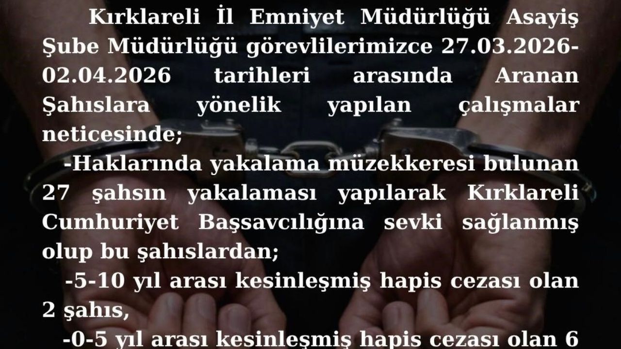 Kırklareli İl Emniyet Müdürlüğü Asayiş Şube Müdürlüğü ekipleri, aranan şahıslara yönelik gerçekleştirdikleri operasyonlarda 8 kişiyi yakaladı ve cezaevine sevk etti. Edinilen bilgilere göre, 27 Mart ile 2 Nisan tarihleri arasında yapılan çalışmalarda, haklarında yakalama emirleri bulunan şahısların tespitine yönelik geniş kapsamlı bir operasyon düzenlendi. Yapılan çalışmalar sonucunda toplamda 27 kişi gözaltına alındı. Emniyetteki işlemleri tamamlanan şahıslar adliyeye sevk edildi. Bu süreçte, 5-10 yıl arasında kesinleşmiş hapis cezası bulunan 2 kişi ile 0-5 yıl arasında cezası bulunan 6 kişi olmak üzere toplam 8 kişi tutuklanarak ceza infaz kurumlarına teslim edildi. Diğer 19 kişi ise ifadelerinin alınmasının ardından serbest bırakıldı. Yetkililer, kamu düzeninin sağlanması için aranan şahısların yakalanmasına yönelik çalışmaların devam edeceğinin altını çizdi.