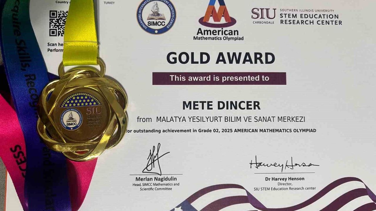 Malatya'da ilkokul öğrencileri, uluslararası matematik olimpiyatında 1 altın ve 2 bronz madalya elde etti. American Mathematics Olympiad (AMO) 2025 sonuçları açıklandı. Analitik düşünme ve problem çözme becerilerinin ölçüldüğü bu prestijli yarışmaya 39 ülkeden yaklaşık 43 bin öğrenci katıldı. Malatya'nın Mehmet Emin Bitlis İlkokulu öğrencileri, dünya sıralamasında derece elde ederek önemli bir başarı gösterdi.