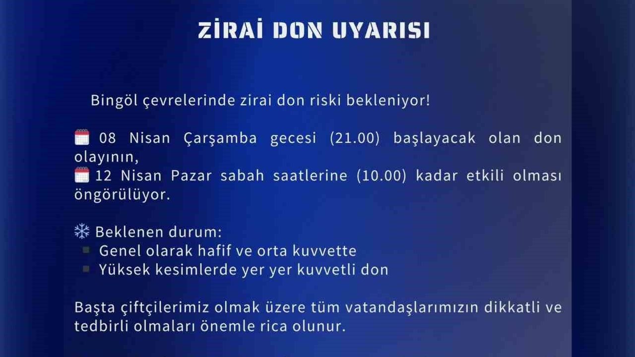 Meteoroloji 13. Bölge Müdürlüğü'nden yapılan açıklamada, “Bingöl çevrelerinde zirai don riski bekleniyor. 08 Nisan Çarşamba gecesi (21.00) başlayacak olan don olayının, 12 Nisan Pazar sabah saatlerine (10.00) kadar etkili olması öngörülüyor. Başta çiftçilerimiz olmak üzere tüm vatandaşlarımızın dikkatli ve tedbirli olmaları önemle rica olunur. Tarımsal faaliyetlerle uğraşan vatandaşlarımızın önlemleri almaları büyük önem taşımaktadır” denildi.