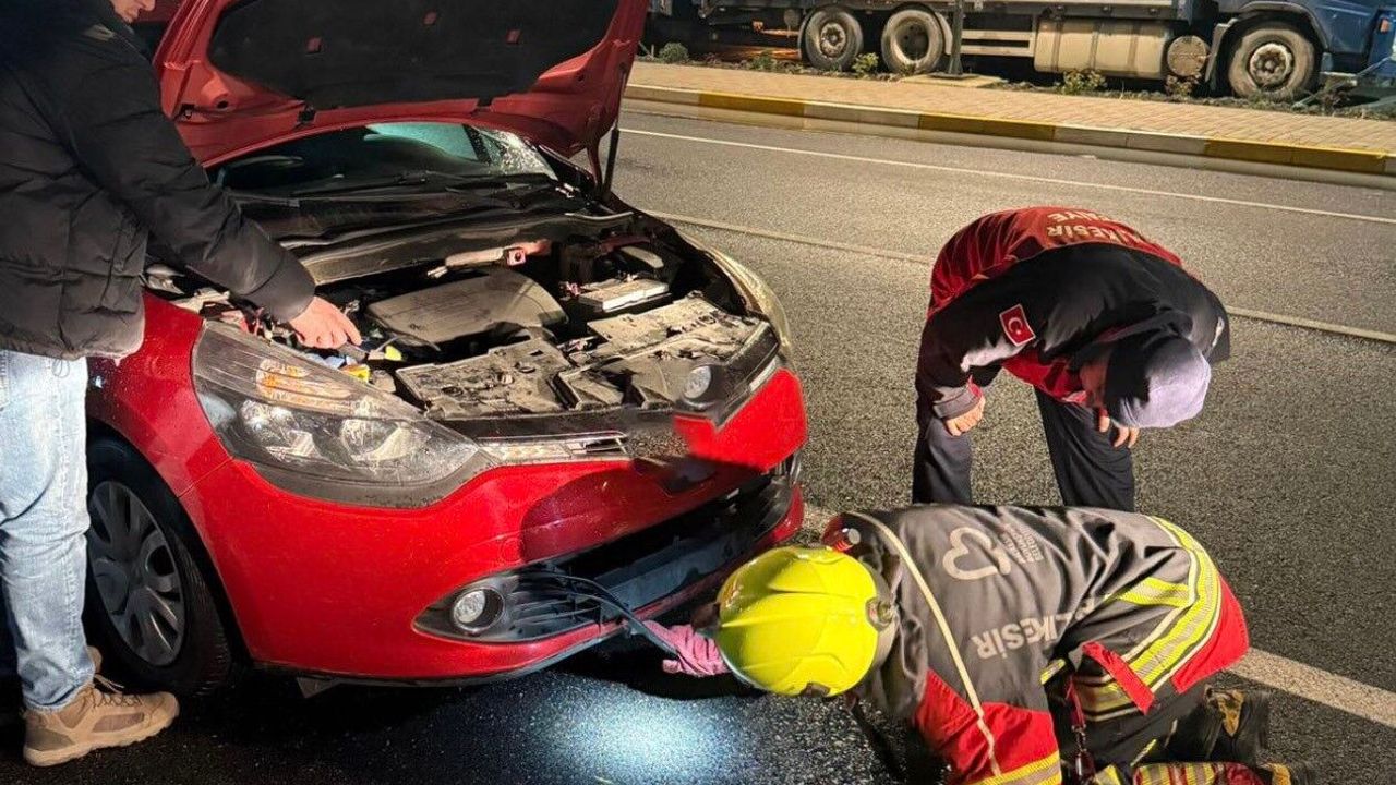 Gönen ilçesinde Plevne Mahallesi Kuvayi Milliye Caddesi üzerinde bir aracın motor kısmından gelen ses üzerine, olay yerine ekipler intikal etti. Sürücünün, Manyas yolu üzerinden Gönen merkezine giderken bir şeye çarptığını düşünmesine rağmen, aracında herhangi bir sorun fark etmemesi nedeniyle yoluna devam ettiği öğrenildi. Mezarlık önüne geldiğinde tekrar ses duyunca durumu merak eden sürücü, kontrol yaparak motor bölümünde bir tilki olduğunu fark etti ve hemen ekiplere haber verdi. Olay yerine ulaşan ekipler, motor kısmında sıkışan tilkiyi kurtarmak için yaklaşık yarım saat süren dikkatli bir çalışma gerçekleştirdi. Yapılan başarılı müdahale sonucunda tilki, zarar görmeden bulunduğu yerden çıkarıldı. Kurtarılan tilkinin sağlık durumunun iyi olduğu, olayda herhangi bir olumsuzluk yaşanmadığı bildirildi.