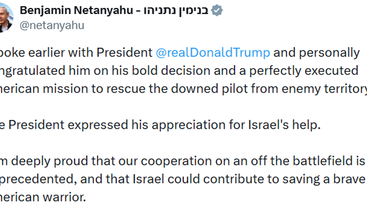 Görüşmenin detaylarına değinen Netanyahu, Trump'ın İsrail'in operasyonu destekleme konusundaki minnettarlığını kendisine ilettiğini belirtti. 'Savaş alanında ve dışında kurduğumuz işbirliğinin eşi benzeri görülmemiş bir düzeyde olmasından ve İsrail'in cesur bir Amerikan savaşçısının kurtarılmasına katkıda bulunabilmesinden büyük gurur duyuyorum' şeklinde konuştu.