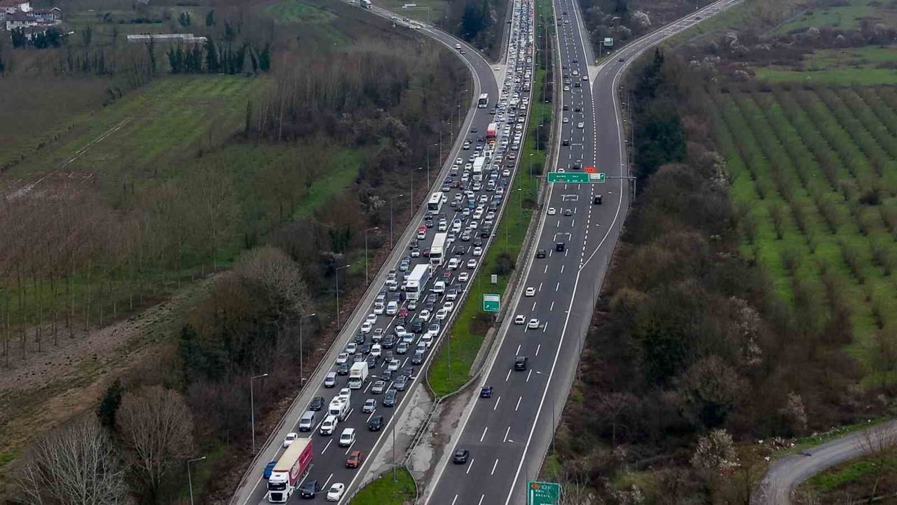 Anadolu Otoyolu'nun Düzce geçişinde, maddi hasara yol açan ve yaralamalı trafik kazalarının artmasıyla birlikte dönüş yolundaki yoğunluk giderek yükseliyor. Bayram tatili dolayısıyla yola çıkan sürücülerin oluşturduğu trafik, kazaların da etkisiyle bazı noktalarda durma aşamasına geliyor. Kazaların meydana geldiği yerlerde araç kuyrukları kilometrelerce uzanırken, ekipler trafik akışını sağlamak ve kazalara müdahale etmek için yoğun çaba harcıyor. Yoğunluk nedeniyle sürücüler ilerlemek konusunda zorluk yaşarken, bazı yerlerde araçların düşük hızda seyrettiği gözlemleniyor. Yetkililer, sürücüleri dikkatli olmaları, takip mesafesi bırakmaları ve trafik kurallarına uymaları hususunda uyarırken, alternatif yolların kullanılmasının yoğunluğu azaltabileceği konusunda bilgilendirme yapıyor.