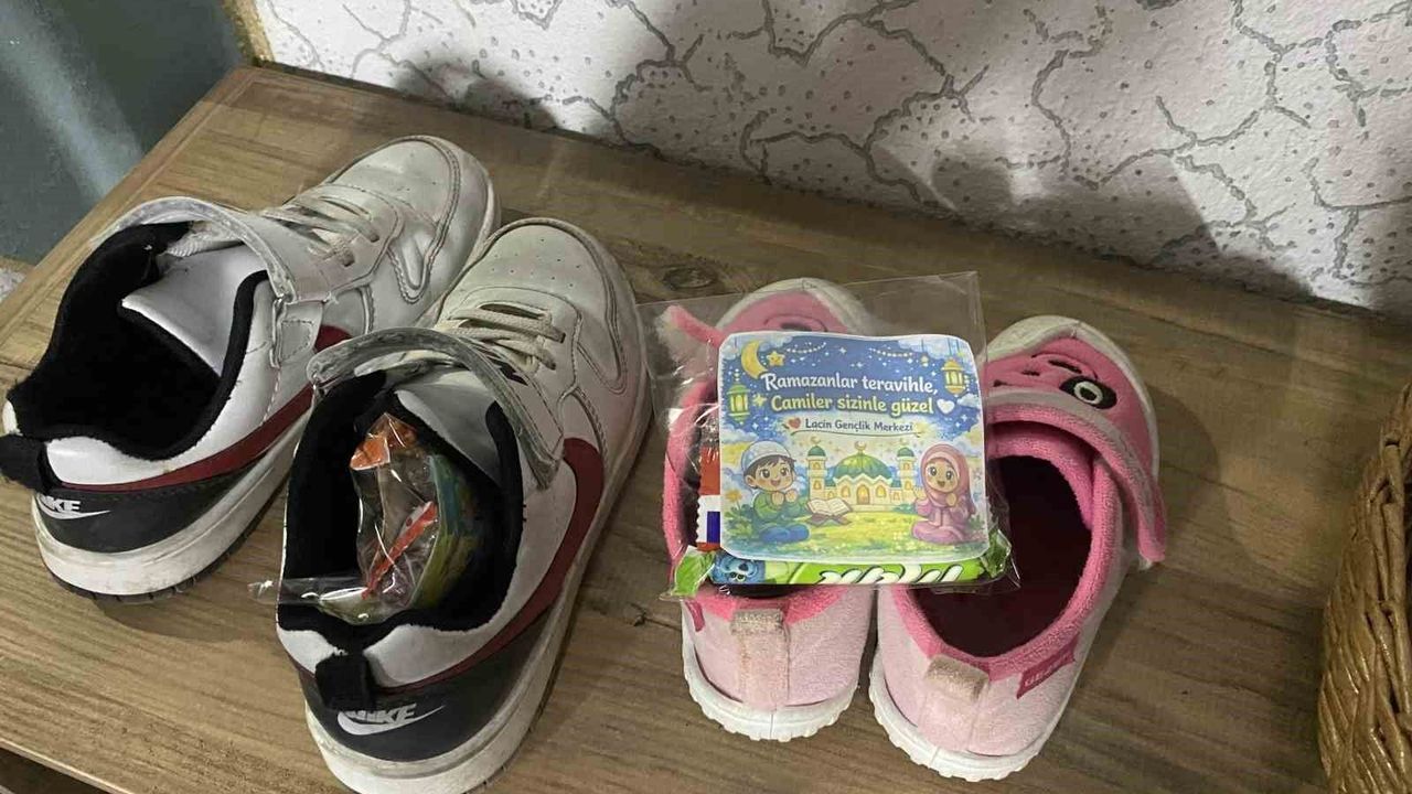 Çorum'un Laçin ilçesinde camiye giden çocuklar, teravih namazı çıkışında ayakkabılarının içine bırakılan sürpriz hediyeleri görünce mutluluk yaşadı.