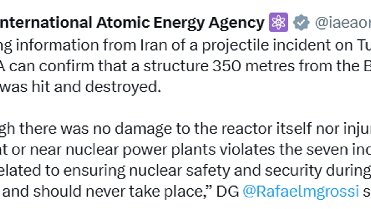 UAEA, İran yönetiminin Buşehr Nükleer Santrali'ne füze isabet ettiğini bildirmesinin ardından bir açıklama yayımladı. Açıklamada, ‘Santralde herhangi bir hasar veya personel yaralanması rapor edilmemiştir. UAEA Başkanı Rafael Grossi, nükleer kaza riskini azaltmak adına çatışmalar sırasında azami dikkat ve itidal gösterilmesi gerektiğini vurgulamıştır' ifadeleri kullanıldı.