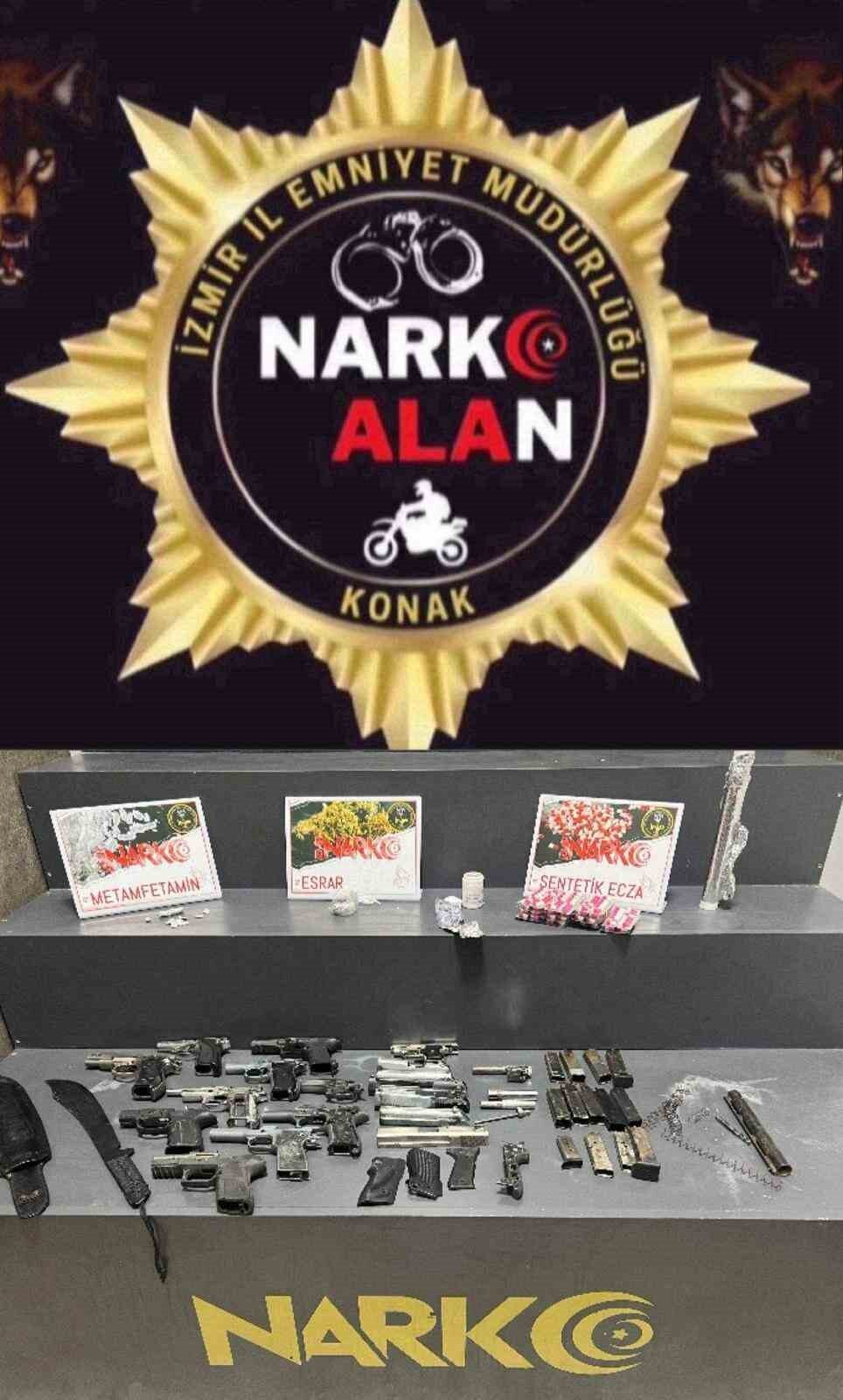 Narko Alan ekipleri, Konak ilçesinde belirlenen 11 farklı iş yeri ve konut için gerçekleştirilen bu operasyonda, önemli miktarda uyuşturucu madde ele geçirdi. Aramalar sırasında; 103.19 gram bonzai, 14.35 gram kokain, 14.46 gram metamfetamin, 849 adet uyuşturucu nitelikli hap, 17.91 gram esrar, 3 hassas terazi, 15 bin 50 TL nakit para, 3 tabanca, 2 pompalı tüfek ile çok sayıda tabanca parçası ve 44 adet 7.65 ile 9.19 milimetre çapında fişek bulundu.