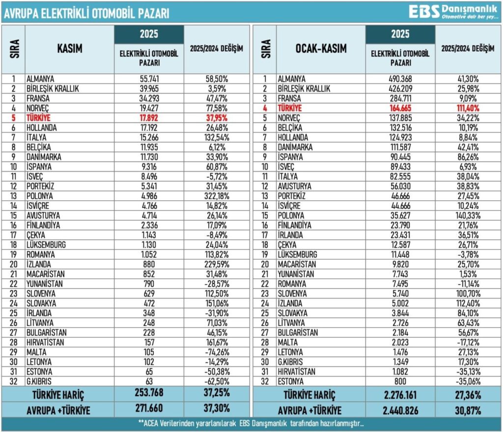 Güncel veriler, Türkiye’nin Avrupa elektrikli otomobil pazarında 2025 yılı Ocak-Kasım döneminde en hızlı büyüyen ülke olduğunu gözler önüne seriyor. Türkiye, bu süre zarfında toplam 164 bin 665 adet elektrikli otomobil satışı gerçekleştirerek Avrupa’nın 32 ülkesi arasında 4. sıradaki konumunu güçlendirdi.
