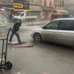 Karaköy Perşembe Pazarı’ndaki esnaf, dükkanlarının önündeki su birikintilerini temizlemeye gayret etti. Yağmur altında sırılsıklam olan esnaf, bir yandan kum torbalarını kapı önüne koyarak su baskınlarına karşı tedbir aldı. Bazı esnafın göle dönen yolları fırça yardımıyla süpürmeye çalıştığı gözlemlendi. Şiddetli rüzgarın etkisiyle bir binadan sıva dökülürken, dükkanın önündeki ürünler yere savruldu. Oradaki esnaf, “Sıvılar düşüyor sıvalar bina yıkılıyor” şeklinde konuştu.
