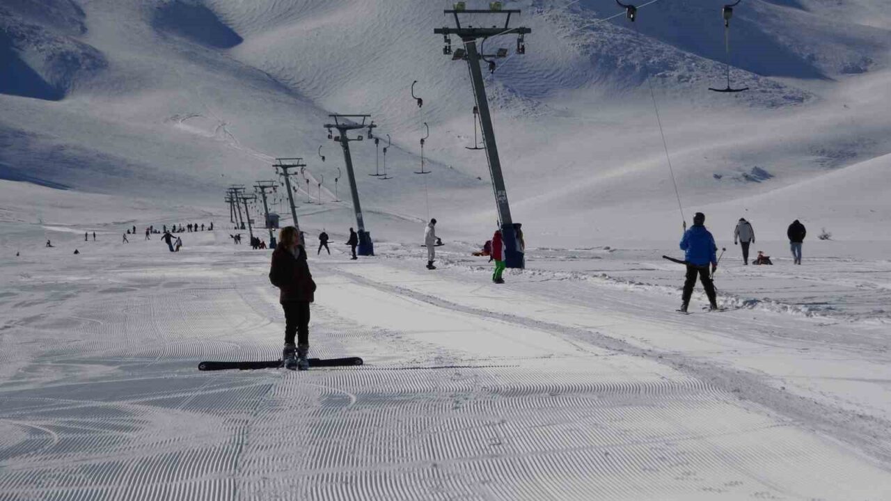 Van’a 45 kilometre mesafedeki Artos Dağı eteklerinde yer alan Abalı Kayak Merkezi, kar yağışının istenen seviyeye ulaşmasıyla birlikte geç de olsa sezonunu açtı. 2025-2026 eğitim öğretim yılı yarıyıl tatilinin ilk gününde kayak merkezine gelen vatandaşlar, pistlerde yoğunluk oluşturdu. Aralıksız yağan karın ardından beyaza bürünen kayak merkezine kayak severler adeta akın ederken, Süphan Dağı ve Van Gölü manzarası eşliğinde kayak yapan vatandaşlar eğlenceli anlar yaşadı. Aileleriyle birlikte gelen öğrenciler ve gençler, yarıyıl tatilini fırsata çevirerek karın tadını çıkardı.
