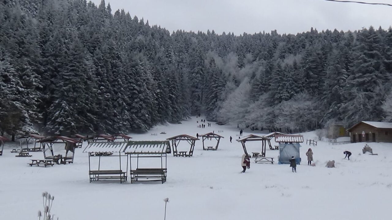 Bolu’nun doğal güzellikleriyle tanınan Abant Gölü Milli Parkı, kar yağışının ardından tamamen beyaz bir örtüyle kaplandı. Hafta sonu tatilini değerlendirmek isteyen yerli ve yabancı turistler milli parka akın ederken, getirdikleri şambrel ve poşetlerle kayarak karın keyfini çıkarıyorlar.
