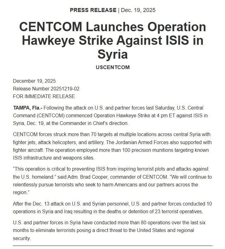 ABD Savunma Bakanı Pete Hegseth ise, operasyondan bahsederken, “Hawkeye Operasyonu, 13 Aralık’taki DEAŞ saldırısına doğrudan bir karşılık niteliği taşımaktadır. Amacımız, DEAŞ unsurlarını, altyapısını ve silah depolarını etkisiz hale getirmektir” ifadelerini kullandı.