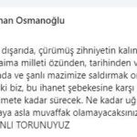 Osmanoğlu, sosyal medyadan yaptığı açıklamada, “Bilecik’teki ata yurdumuzda kökü dışarıda, çürümüş zihniyetin kalıntıları bir kez daha hareket geçti. Bu zihniyet, milletimizi özünden, tarihinden ve inancından uzaklaştırma çabalarını her zaman sürdürmektedir. Osmanlı’ya, ecdadımıza ve aziz geçmişimize saldırmak, onların yüzyıllardır süregelen alışkanlığı olmuştur. Ancak unutmasınlar ki, bu ihanet şebekesine karşı her daim tetikte olacağız. Mücadelemiz kıyamete değin devam edecek. Ne kadar çabalarsanız çabalayın, bu milleti köklerinden koparmaya asla muvaffak olamayacaksınız” ifadelerini kullandı.