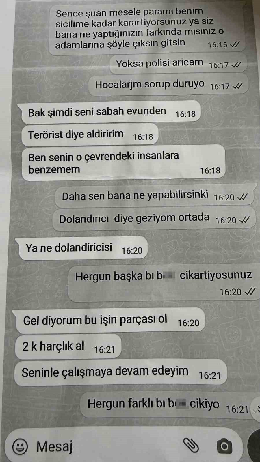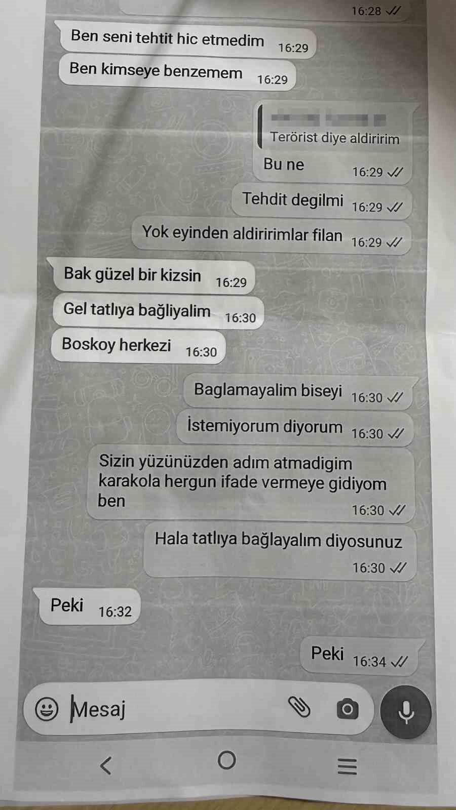 Hakkında açılan 20 davadan 11’inin ülke genelindeki çeşitli mahkemelerde sürdüğünü söyleyen Özlem Develi, M.D. hakkında şikayetçi olduğu için tehditlere maruz kaldığını, M.D.’nin “Seni sabah evinden terörist diye aldırırım. Gel bu işin parçası ol, 2 bin lira harçlık al, seninle çalışmaya devam edeyim. Güzel bir kızsın, gel tatlıya bağlayalım” şeklinde kendisine mesaj attığını ifade etti.