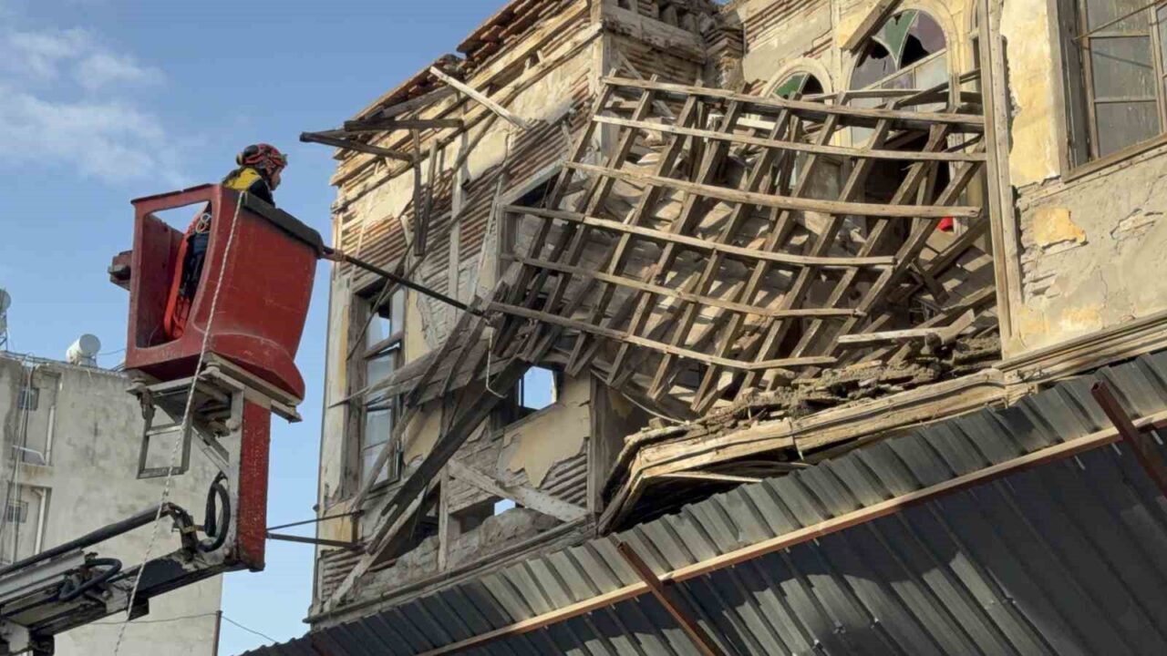 Adana’da tarihi bir binanın çatısı kısmen çökerken, ekipler çevrede güvenlik önlemleri alıp çöken çatıdaki tahtaları kestiler.
