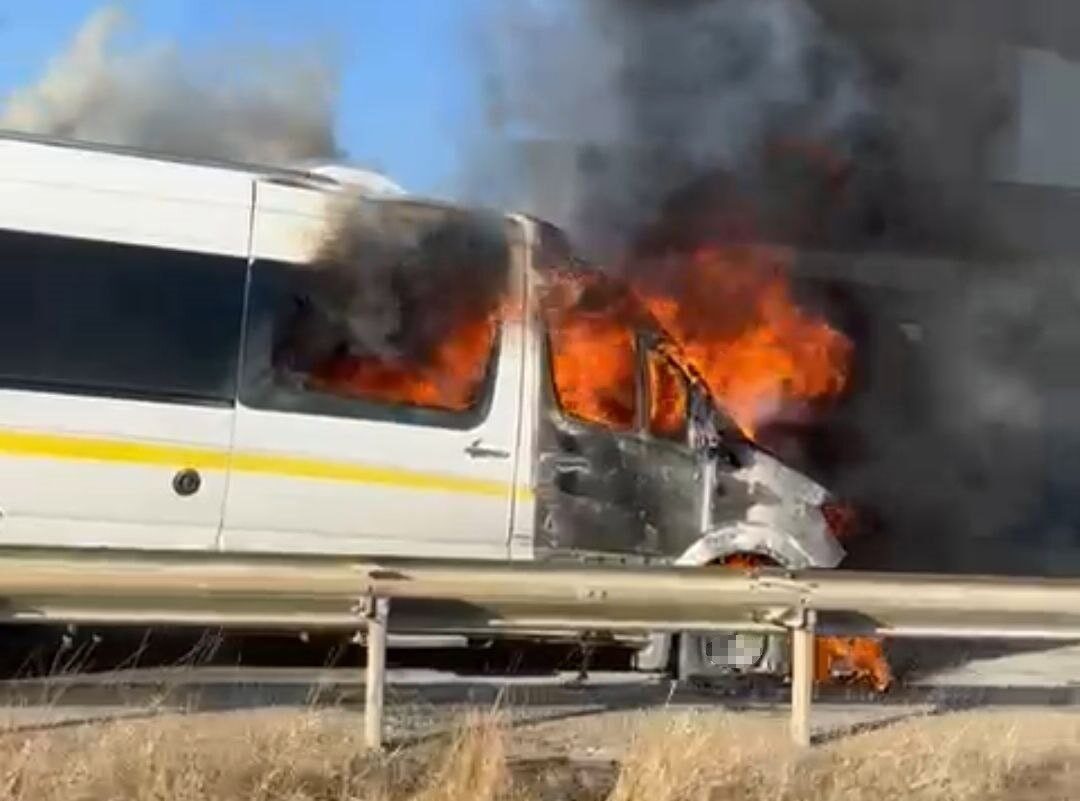 Bir öğrenci servisi alevler içinde kaldı ve olay sırasında içindeki öğrenciler hızla güvenli bir şekilde tahliye edildi.