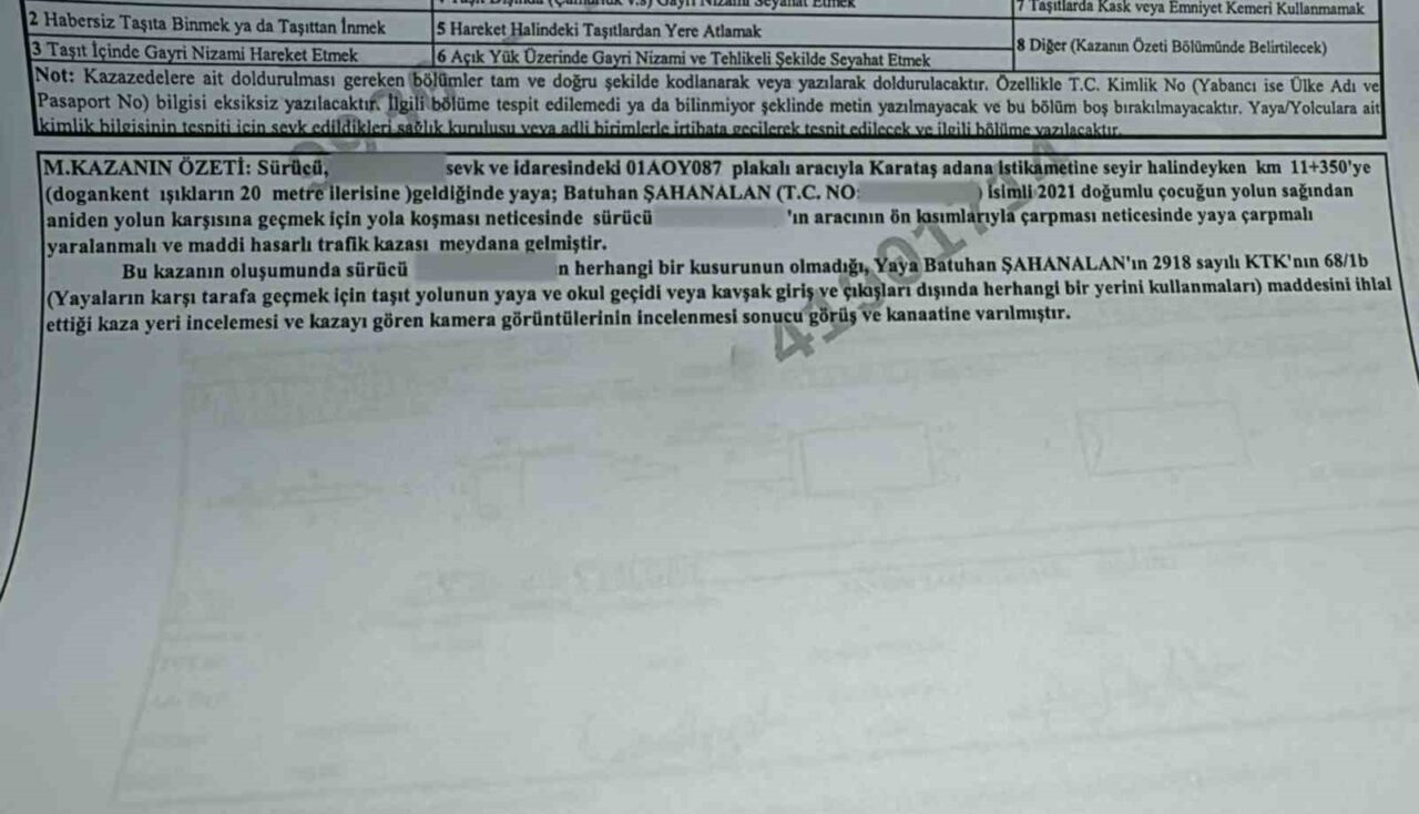 Adana’da 5 yaşındaki engelli Batuhan Şahanalan, yol geçerken kamyonetin çarpması sonucu ağır yaralandı. Kazada çocuğun kusurlu olduğu tespit edilirken, anne Leyla Şahanalan, rapora itiraz ederek sürücünün hız yaptığını ve kontrolsüz davrandığını ifade etti. Batuhan’ın hayati tehlikesi sürüyor.