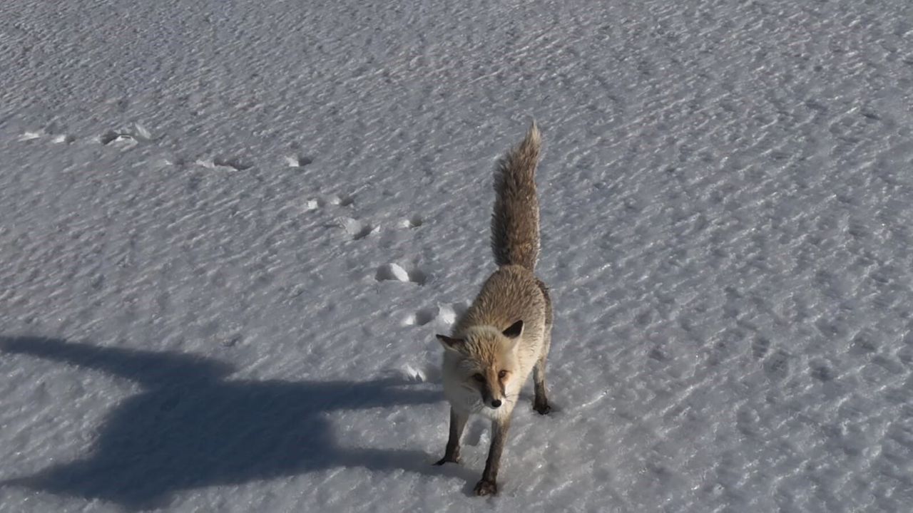 Kar üzerinde yiyecek aradığı tahmin edilen tilki, bir anda üzerine gelen dronun sesini fark etti. Önce kısa süreli duraksayan hayvan, ardından hızla yön değiştirerek uzaklaşmaya çalıştı. Ancak bir süre sonra drona doğru temkinli adımlar attı.