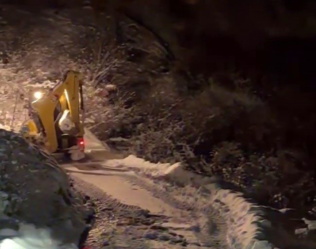 Kar yağışının yer yer yarım metreyi aştığı yüksek kesimlerde, bir taraftan karla mücadele sürerken diğer taraftan ambulansların hastalara ulaşmasına destek olunuyor. Yolda kalan araçlar iş makineleri tarafından çekiliyor.