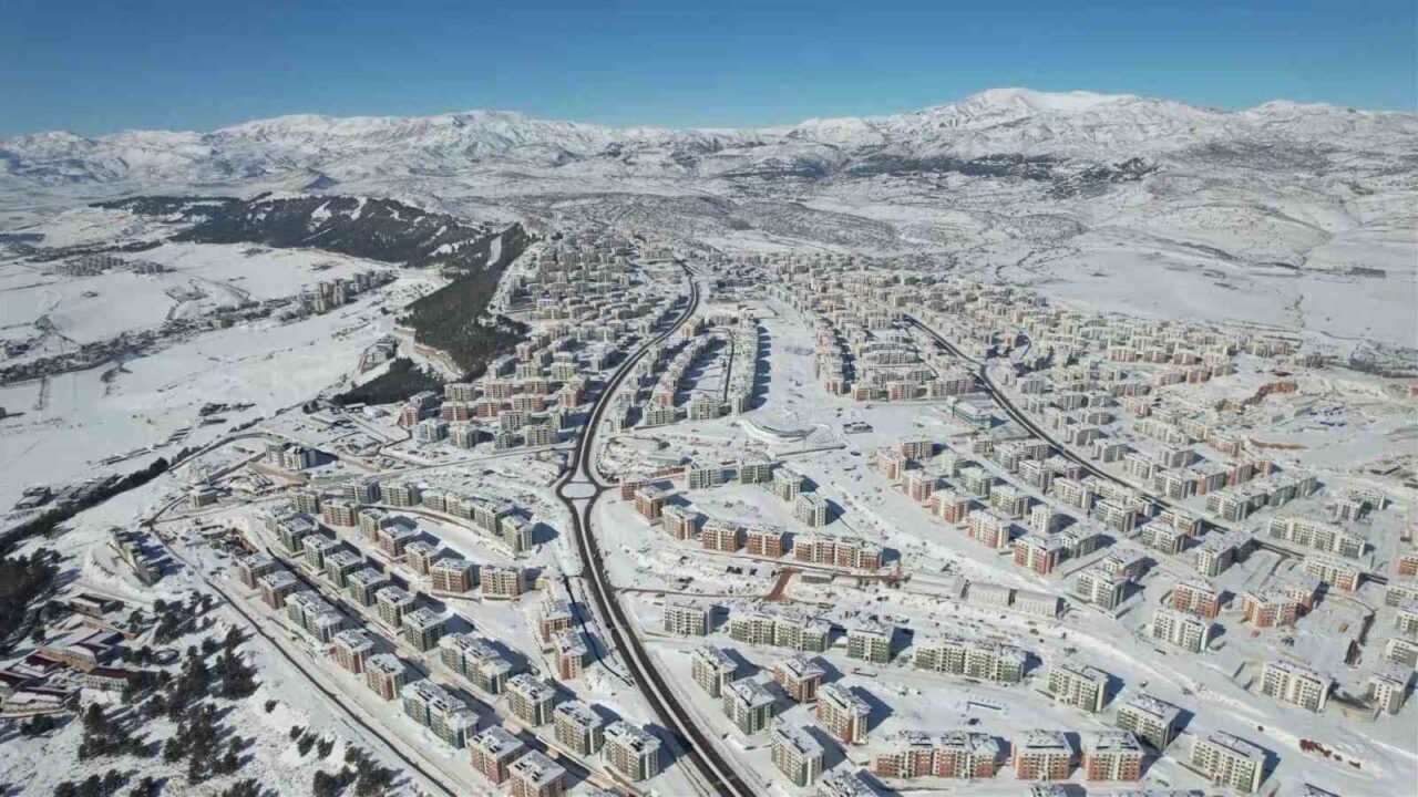 hava sıcaklığının eksi 9’a kadar düştüğü kış günlerinde sıcak yuvalarında yaşamaktadır. Kar altında kartpostallık görüntülere sahne olan deprem konutları havadan görüntülendi.