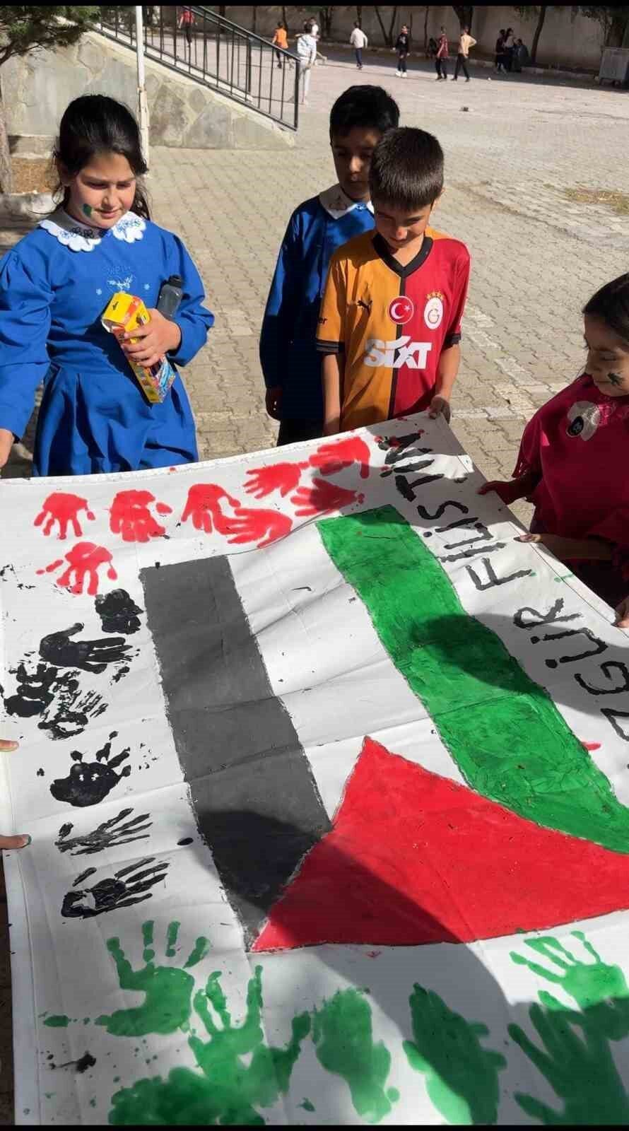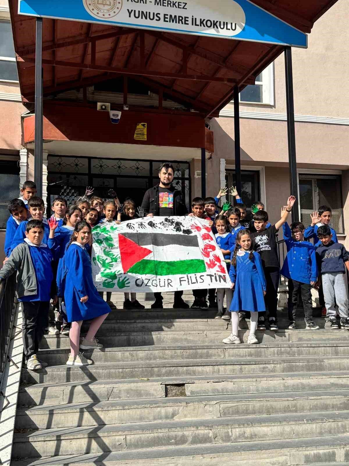 Ağrı Merkez Yunus Emre İlkokulu’ndaki genç bireyler, öğretmenleri Recep Akbaş’ın önderliğinde farkındalık yaratacak bir etkinlik gerçekleştirdi. Minik yürekler, Filistin halkına destek sunmak ve dünya genelinde barış çağrısında bulunmak için “Özgür Filistin” adlı temalı bir pankart tasarladı.
