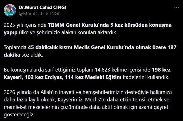 Cıngı, sosyal medya üzerinden yaptığı paylaşımda, “2025 yılı içerisinde TBMM Genel Kurulu’nda 5 kez kürsüden konuşma yapıp ülke ve şehrimizle alakalı konuları aktardık. Toplamda 45 dakikalık kısmı Meclis Genel Kurulu’nda olmak üzere 187 dakika söz aldık. Bu konuşmalarda sarf ettiğimiz toplam 14 bin 623 kelime içerisinde 198 kez Kayseri, 102 kez Erciyes, 114 kez mesleki eğitim ifadelerini kullandık. 2026 yılında da Allah’ın inayeti ve hemşehrilerimizin desteğiyle halkımıza daha fazla layık olmak, Kayserimizi Meclis’te daha etkin temsil etmek ve memleket meselelerinin çözümünde daha aktif olmak için azami gayreti göstereceğiz” şeklinde konuştu.