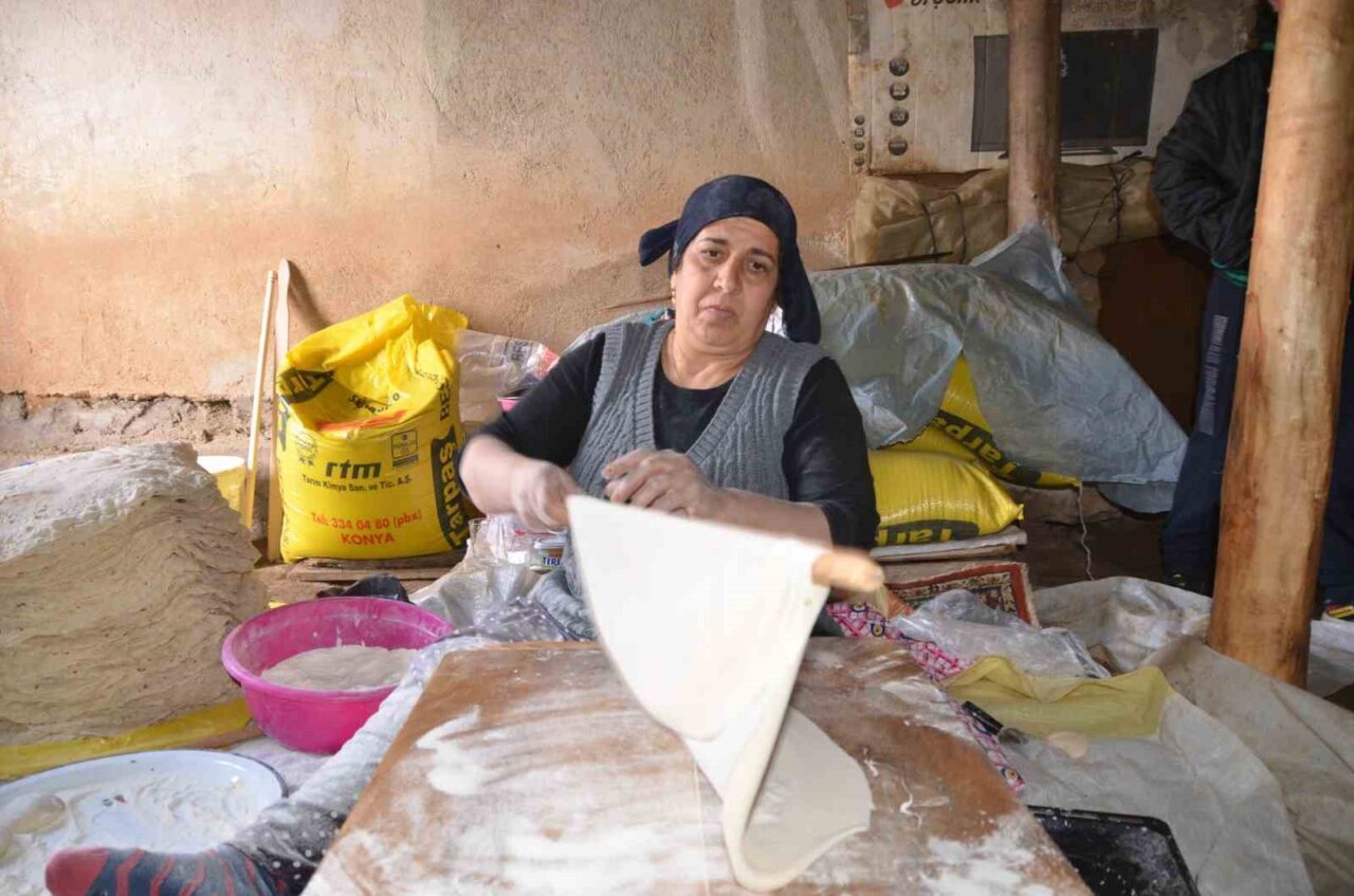 “Mahallede yılda iki kez bir araya gelir, genellikle ikişer çuval undan ekmek pişiririz. Bu bize yaklaşık 6 ay yeter. Yufka ekmek yapmayı rahmetli annemden öğrendim. Biz Yörük’tük, göç ederdik. Dağda mecburen yufka yapardık. 6 yaşımdan beri ekmek pişiriyorum” diye konuştu.