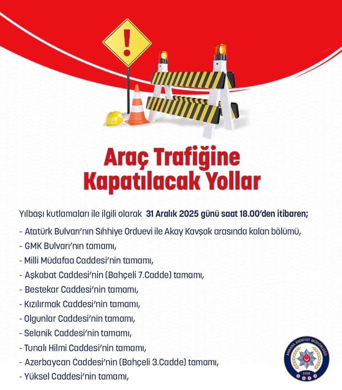 “Yılbaşı kutlamaları ile ilgili olarak 31 Aralık 2025 günü saat 18.00’den itibaren; Atatürk Bulvarı’nın Sıhhiye Orduevi ile Akay Kavşak arasında kalan bölümü, GMK Bulvarı’nın tamamı, Milli Müdafaa Caddesi’nin tamamı, Aşkabat Caddesi’nin (Bahçeli 7.Cadde) tamamı, Bestekar Caddesi’nin tamamı, Kızılırmak Caddesi’nin tamamı, Olgunlar Caddesi’nin tamamı, Selanik Caddesi’nin tamamı, Tunalı Hilmi Caddesi’nin tamamı, Azerbaycan Caddesi’nin (Bahçeli 3.Cadde) tamamı, Yüksel Caddesi’nin tamamı, Sakarya Caddesi’nin tamamı, Kumrular Caddesi’nin tamamı, Tunus Caddesi’nin tamamı, Tuna Caddesi’nin tamamı, Ziya Gökalp Caddesi’nin Kolej Kavsak ile Kızılay Kavsak arasında kalan bölümü, İnkılap Sokağı’nın tamamı, Konur Sokağı’nın tamamı, Karanfil Sokağı’nın tamamı, Bilge Sokağı’nın tamamı, Bülten Sokağı’nın tamamı, Çığır Sokağı’nın tamamı, Bayındır Sokağı’nın tamamı, ihtiyaç olması halinde; Oğuzhan Asiltürk Caddesi’nin tamamı, Meşrutiyet Caddesi’nin tamamı, Filistin Caddesi’nin tamamı, Polonya Caddesi’nin tamamı, İran Caddesi’nin tamamı, Arjantin Caddesi’nin tamamı, Kuleli Caddesi’nin tamamı programlar sona erene kadar trafiğe kapatılacaktır. Kamuoyuna saygıyla duyurulur.”