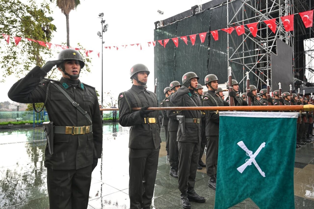 Antalya’da gerçekleşen 29 Ekim Cumhuriyet Bayramı kutlamaları, sağanak yağışa rağmen büyük bir coşkuyla yapıldı. Protokol üyeleri, öğrenciler ve vatandaşlar, Cumhuriyet Meydanı’nda yağmura aldırış etmeden yerlerini korudular. Tören boyunca şemsiye kullanmayan protokol üyeleri, ıslanmaktan çekinmeden etkinliğe katıldı.
