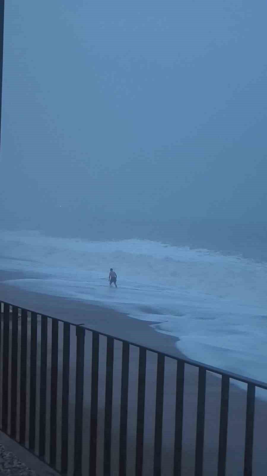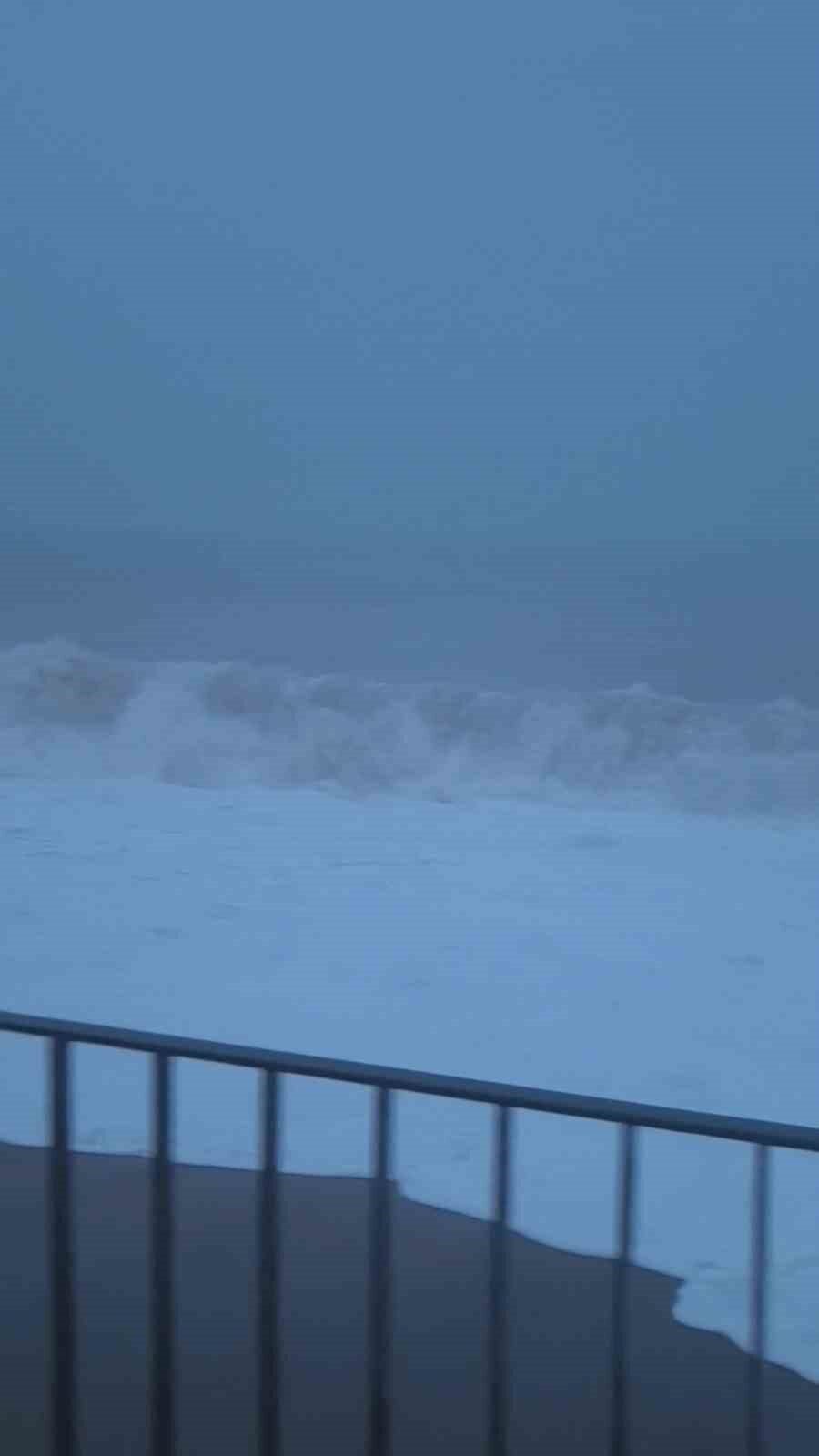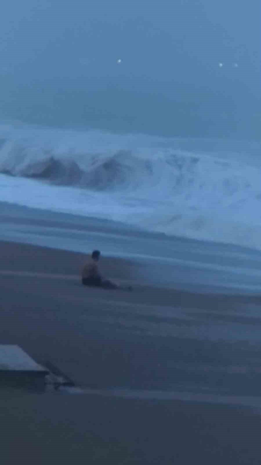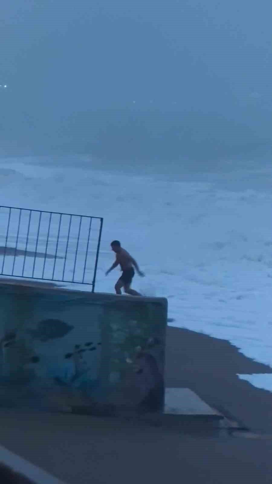 Antalya’da şiddetli rüzgar nedeniyle oluşan dev dalgalar sahili döverken, bir vatandaş dalgaların arasında şınav çekerek sabah sporu yaptı. O anlar başka bir vatandaşın cep telefonu kamerasına yansıdı.