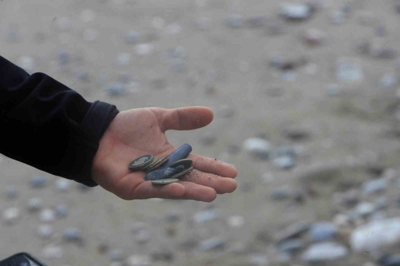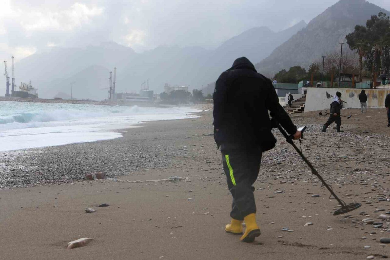 Antalya’da saatteki hızı 50 kilometreye ulaşan rüzgar, yaşamı olumsuz etkilerken define avcıları da sahile inerek değerli eşya ve madeni para aradı.
