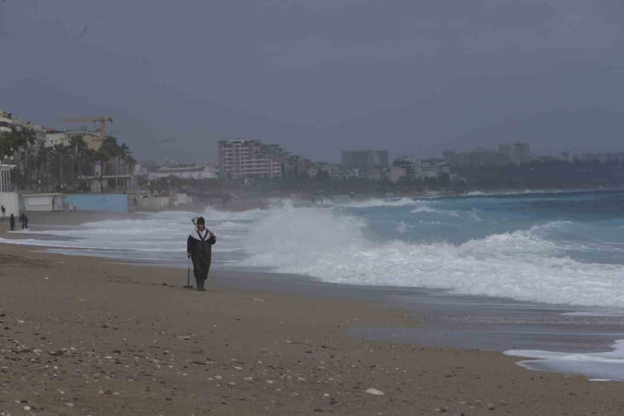 Antalya’da saatteki hızı 50 kilometreye ulaşan rüzgar, yaşamı olumsuz etkilerken define avcıları da sahile inerek değerli eşya ve madeni para aradı.