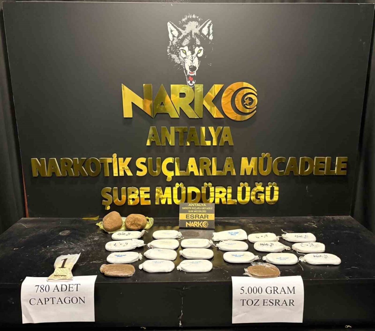 Antalya İl Emniyet Müdürlüğü Narkotik Suçlarla Mücadele Şube Müdürlüğü tarafından yürütülen operasyonlar çerçevesinde, il genelinde uyuşturucu suçlarına yönelik ciddi bir mücadele yürütüldü. Gerçekleştirilen operasyonlar sırasında; 15 kilogram esrar, 780 adet captagon hap, 189 sentetik ecza, 144 gram kokain, 69 adet sentetik kannabinoid (A4) ve yaklaşık 14 bin 838 kullanımlık sentetik marijuana, 35 gram metamfetamin, 11 gram eroin, ayrıca uyuşturucu ticareti yapılmasında kullanılan 2 hassas terazi, 5 ateşli silah ve 13 fişek bulundu. Operasyonlarda, suç faaliyetlerinden elde edildiği değerlendirilen bir miktar döviz ile Türk Lirası da ele geçirildi.