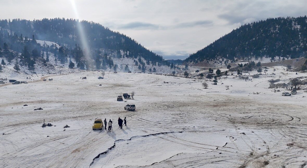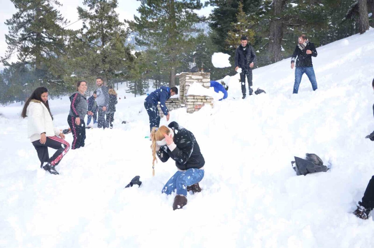 Manavgat’tan araçlarıyla yaklaşık bir saatlik yolculuk yapan vatandaşlar, Torosların zirvesinde kış manzarasıyla karşılaştı.