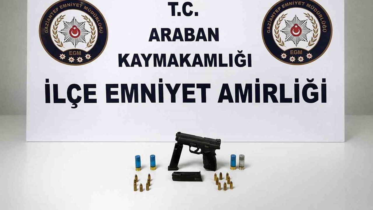 Gaziantep'in Araban ilçesinde, yol kontrol noktasında durdurulan şüpheli araçta, 1 adet ruhsatsız tabanca, 2 adet şarjör ve 15 adet mermi ele geçirildi.