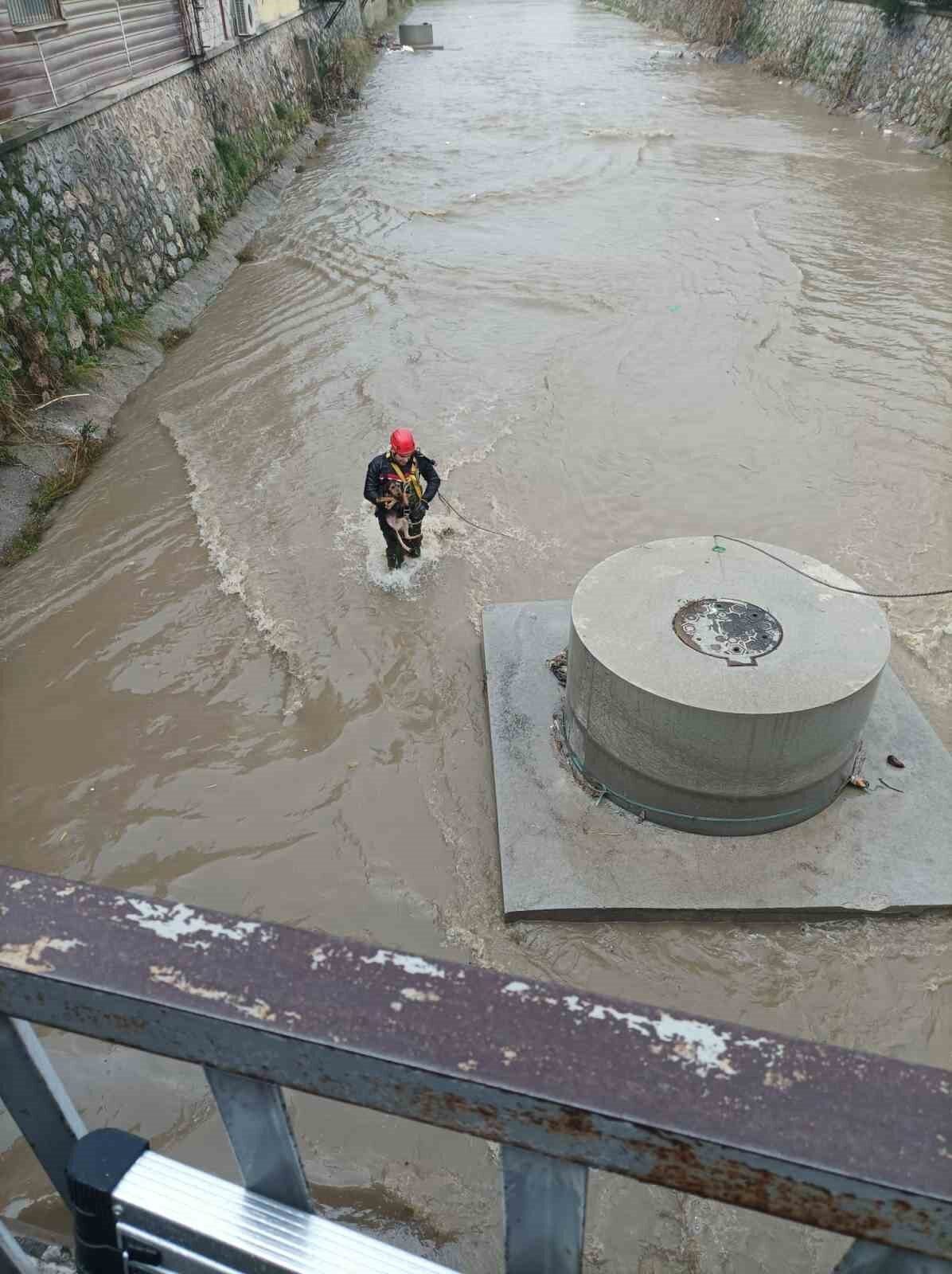 Karabağlar ilçesi Aşık Veysel Mahallesi’nde dere yatağına düşen bir köpeğin fark edilmesi üzerine çevre sakinleri durumu 112 Acil Çağrı Merkezi’ne bildirdi. Yağış nedeniyle su seviyesinin yükseldiği dereden köpeğin kurtarılması için İzmir Büyükşehir Belediyesi İtfaiye Dairesi Başkanlığı ekipleri, arazöz ve kurtarma aracıyla bölgeye yönlendirildi. Olay yerine kısa sürede ulaşan ekipler, dere yatağında mahsur kalan köpeği kurtarmak amacıyla çalışma başlattı. Yaklaşık 10 dakika içinde bulunduğu yerden güvenli bir şekilde çıkarılan köpeğin sağlık durumunun iyi olduğu öğrenildi.