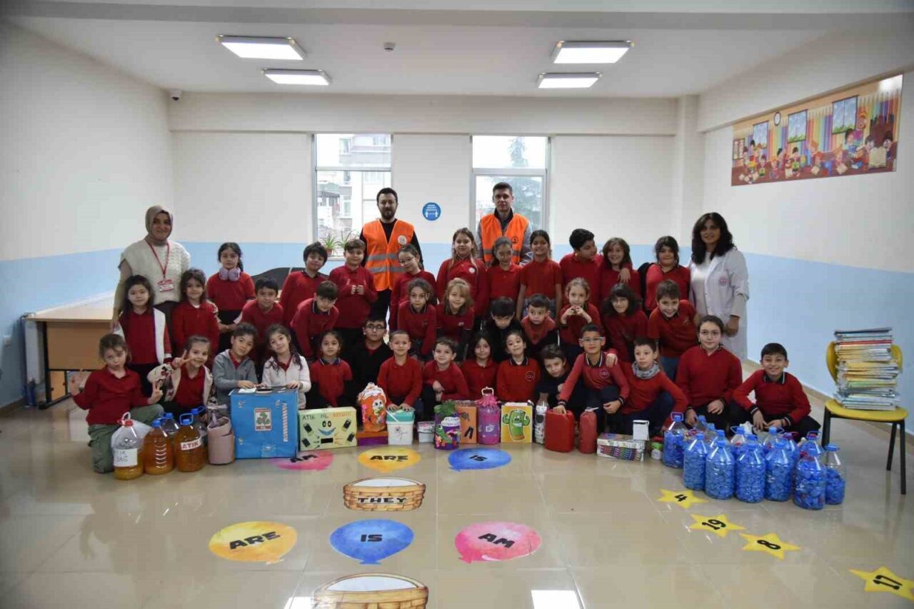 Öğrenciler, etkinlikte biriktirdikleri atıkları belediye ekiplerine teslim ederek doğaya katkı sağladılar.