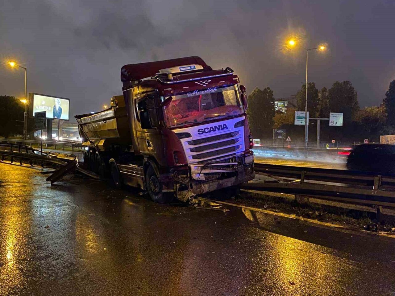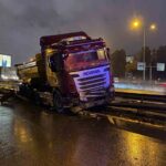 İstanbul’un Ataşehir ilçesinde, etkili olan yoğun yağışlar sonucu kayganlaşan yolda bir hafriyat kamyonu, virajı dönerken direksiyon hakimiyetini kaybederek bariyerlere çarptı.