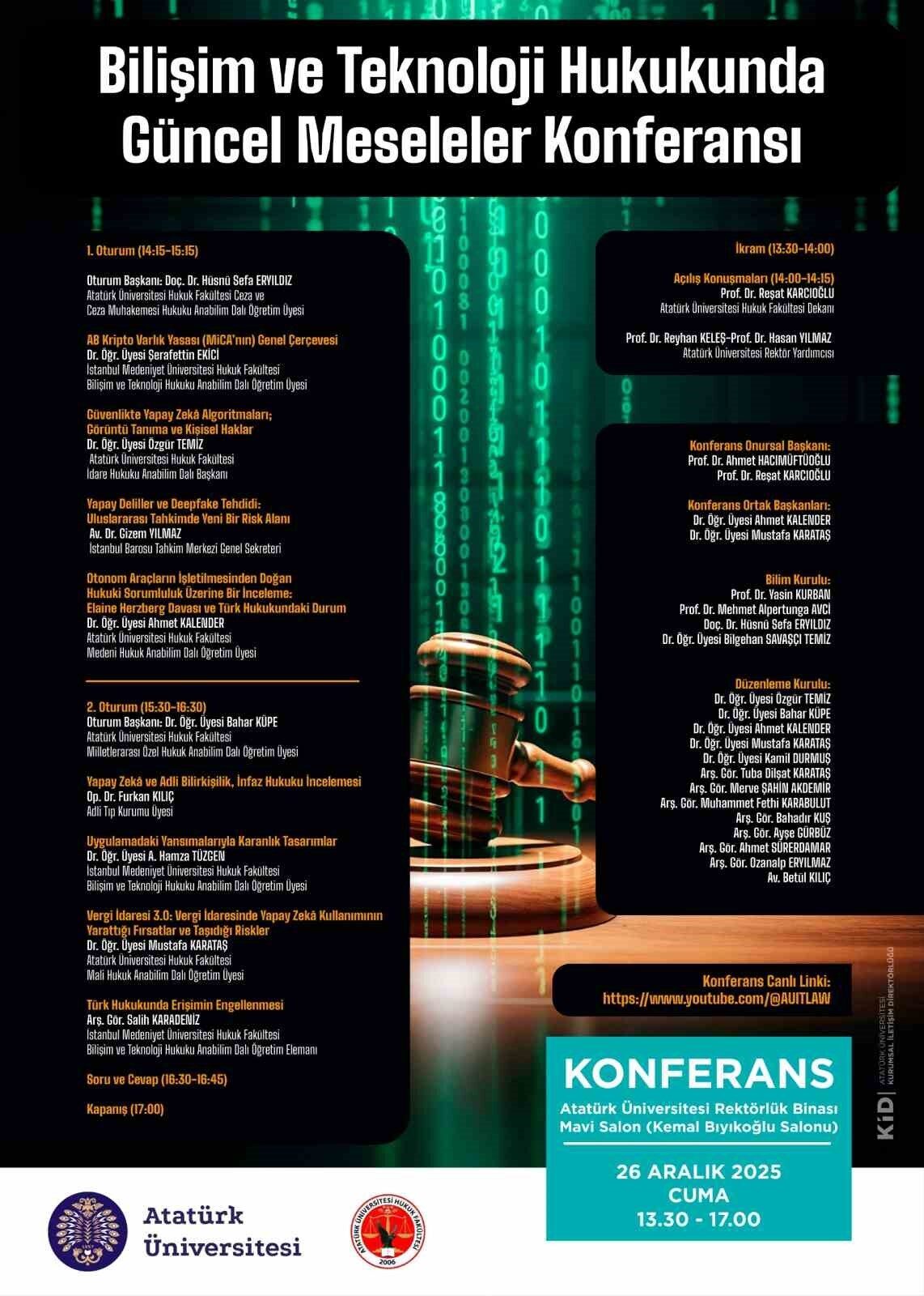 Konferansta, İstanbul Medeniyet Üniversitesi Hukuk Fakültesi Bilişim ve Teknoloji Hukuku ABD Öğretim Üyesi, Dr. Öğr. Üyesi Şerafettin Ekici, AB Kripto Varlık Yasası (MiCA’nın) Genel Çerçevesi; Atatürk Üniversitesi Hukuk Fakültesi İdare Hukuku ABD Başkanı Dr. Öğr. Üyesi Özgür Temiz, Güvenlikte Yapay Zekâ Algoritmaları; Görüntü Tanıma ve Kişisel Haklar; İstanbul Barosu Tahkim Merkezi Genel Sekreteri/Fatih Sultan Mehmet Vakıf Üniversitesi Hukuk Fakültesi Avrupa Birliği Hukuku ABD Öğretim Üyesi, Av. Dr. Öğr. Üyesi Gizem Yılmaz, Yapay Deliller ve Deepfake Tehdidi: Uluslararası Tahkimde Yeni Bir Risk Alanı; Atatürk Üniversitesi Hukuk Fakültesi Medeni Hukuk ABD Öğretim Üyesi/Bilişim ve Teknoloji Hukuku ABD Başkanı Dr. Öğr. Üyesi Ahmet Kalender, Otonom Araçların İşletilmesinden Doğan Hukuki sorumluluk üzerine bir inceleme: Elaine Herzberg Davası ve Türk Hukukundaki Durum; Adli Tıp Kurumu Üyesi Op. Dr. Furkan Kılıç, Yapay Zekâ ve Adli Bilirkişilik, İnfaz Hukuku İncelemesi; İstanbul Medeniyet Üniversitesi Hukuk Fakültesi Bilişim ve Teknoloji Hukuku ABD Öğretim Üyesi Dr. Öğr. Üyesi A. Hamza Tüzgen, Uygulamadaki Yansımalarıyla Karanlık Tasarımlar; Atatürk Üniversitesi Hukuk Fakültesi Mali ABD Öğretim Üyesi Dr. Öğr. Üyesi Mustafa Karataş, Vergi İdaresi 3.0: Vergi İdaresinde Yapay Zekâ Kullanımının ortaya çıkardığı fırsatlar ve taşıdığı riskler ve İstanbul Medeniyet Üniversitesi Hukuk Fakültesi Bilişim ve Teknoloji Hukuku ABD Öğretim Elemanı Arş. Gör. Salih Karadeniz, Türk Hukukunda Erişimin Engellenmesi başlıklı bildirilerini sundu.
