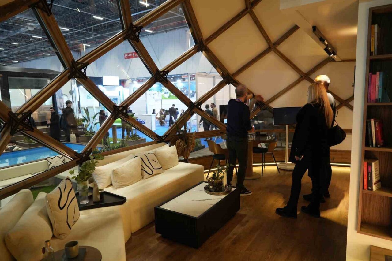 Fuarda sergilenen Pangolin evleri, klasik bungalov ve prefabrik yapılardan tamamen ayrışan tasarımıyla öne çıktı.