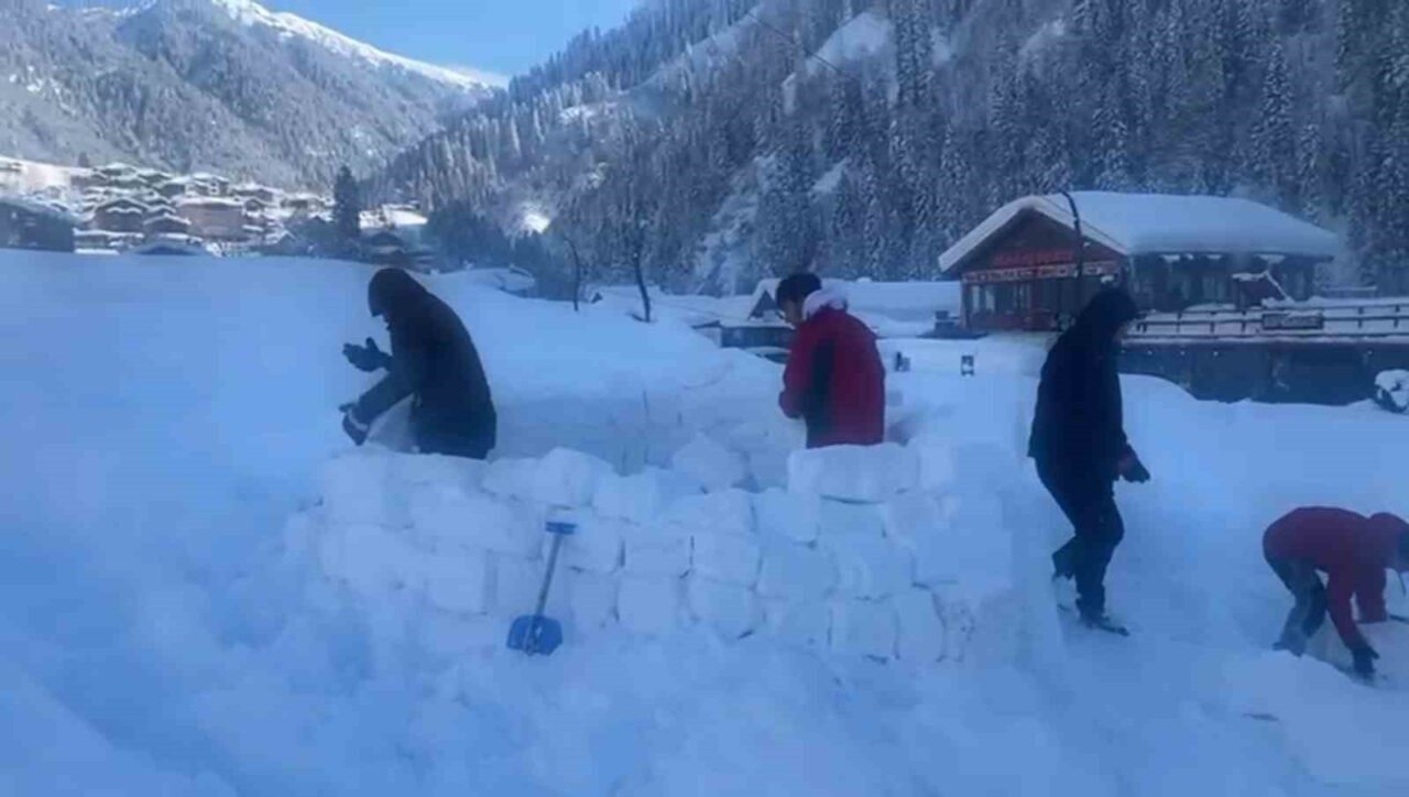 Ayder Yaylası’nda bu hafta sonu gerçekleştirileceği planlanan Kış Festivali’nin hazırlıkları kapsamında yayla sakinleri yöredeki karı ağaç motorlarıyla keserek iglo evleri inşa etti. Yaklaşık bir haftadır yağan ve zemine yerleşen kar kütleleri ağaç motoruyla kesilirken, kesilen donmuş kar kütleleri iglo yapımında kullanıldı.