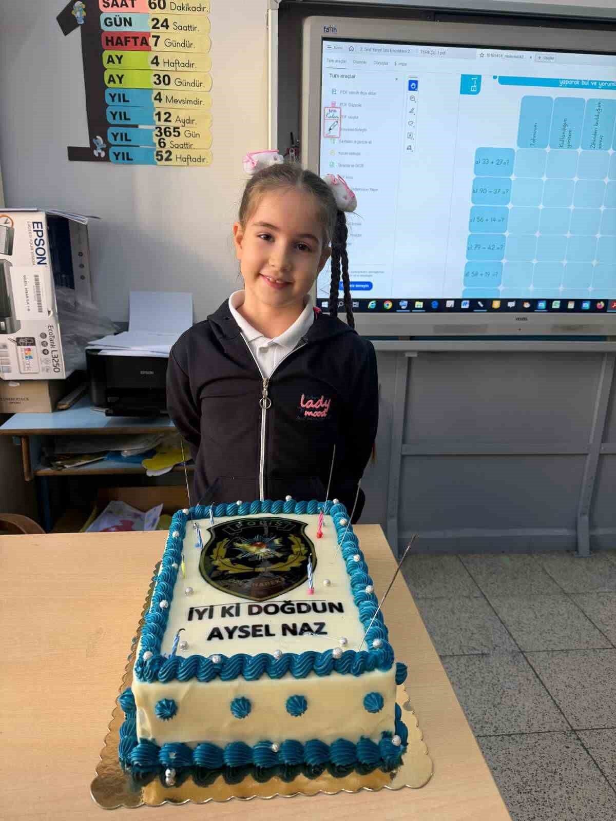 Bingöl’de 2022 yılında gerçekleşen patlamada ağır yaralanarak şehit düşen Özel Harekat Polisi Necati Aygün, Çine Karakollar Merkez Camii’nde düzenlenen törenin ardından toprağa verilmişti. Şehit Aygün’ün Aydın’ın Efeler ilçesinde bulunan Güzelhisar İlkokulu’nda okuyan 8 yaşındaki kızı Aysel Naz Aygün’e doğum gününde Aydın Özel Harekat Şube Müdürlüğü ekipleri sürpriz yaptı. İlkokul ikinci sınıfa giden Aygün’ün sınıfına giren Özel Harekat polisleri, sınıfa pasta ile gelerek küçük kıza hediyeler sundu. Duygusal anların yaşandığı kutlamada, minik Aysel Naz’ın mutluluğu yüzüne yansıdı.
