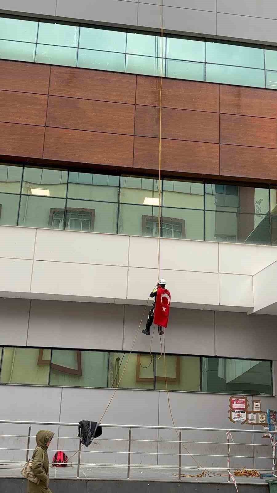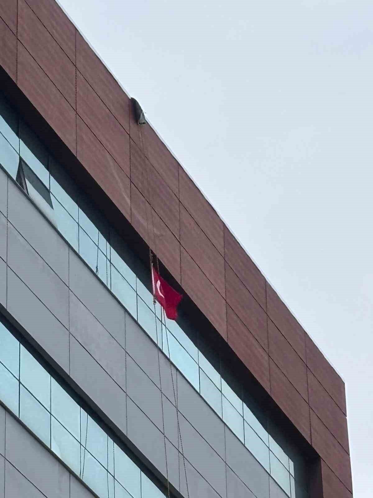 Mardin’in Nusaybin ilçesinde sınır hattında dikili bulunan Türk Bayrağı’nın terör örgütü yandaşları tarafından indirilmesi, Türkiye genelinde büyük tepki topladı. Saldırıya bireysel bir duruşla tepki gösteren endüstriyel iple erişim uzmanı Barış Özbey, Türk Bayrağı ile yaklaşık 30 metre yüksekliğindeki 5’inci kata tırmanarak bayrağı binanın en üst noktasına astı. Özbey, ‘Mardin’in Nusaybin ilçesinde yaşanan alçak saldırıya tepki göstermek adına böyle bir şey yaptım. Yaklaşık 30 metre tırmanarak şanlı Türk Bayrağımızı zirveye astım. Bu saldırıyı şiddetle lanetliyorum’ ifadelerini kullandı.
