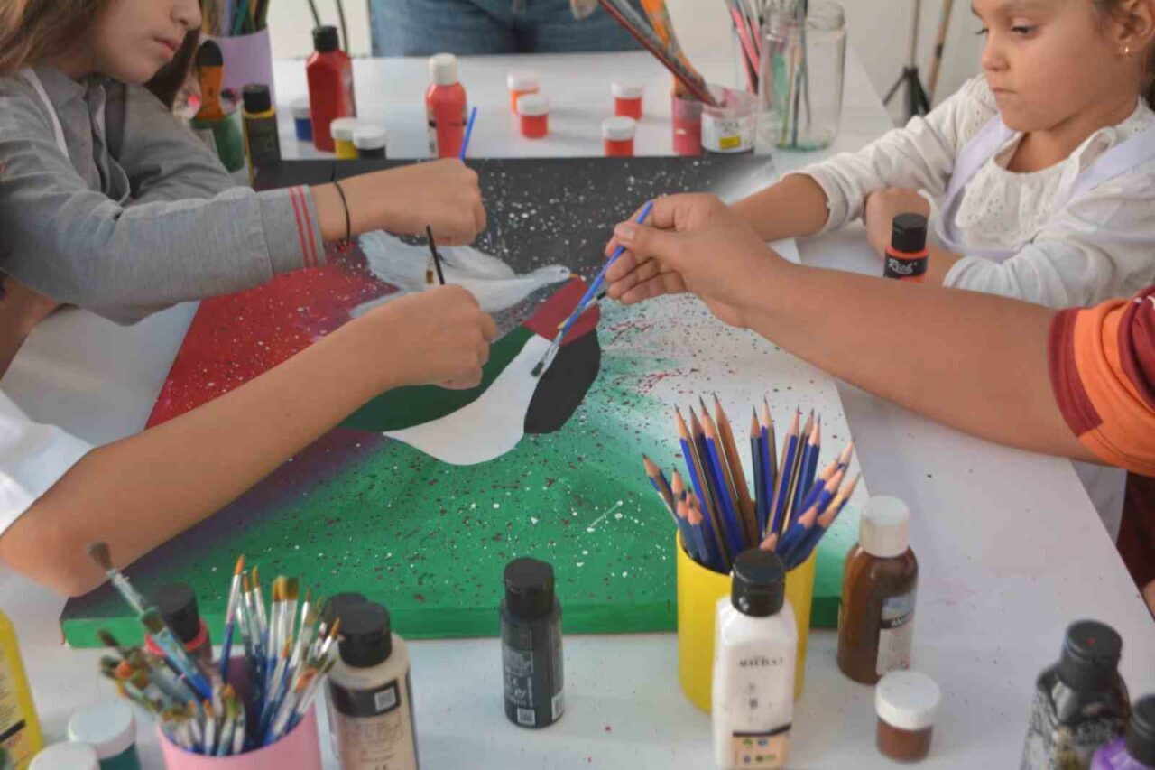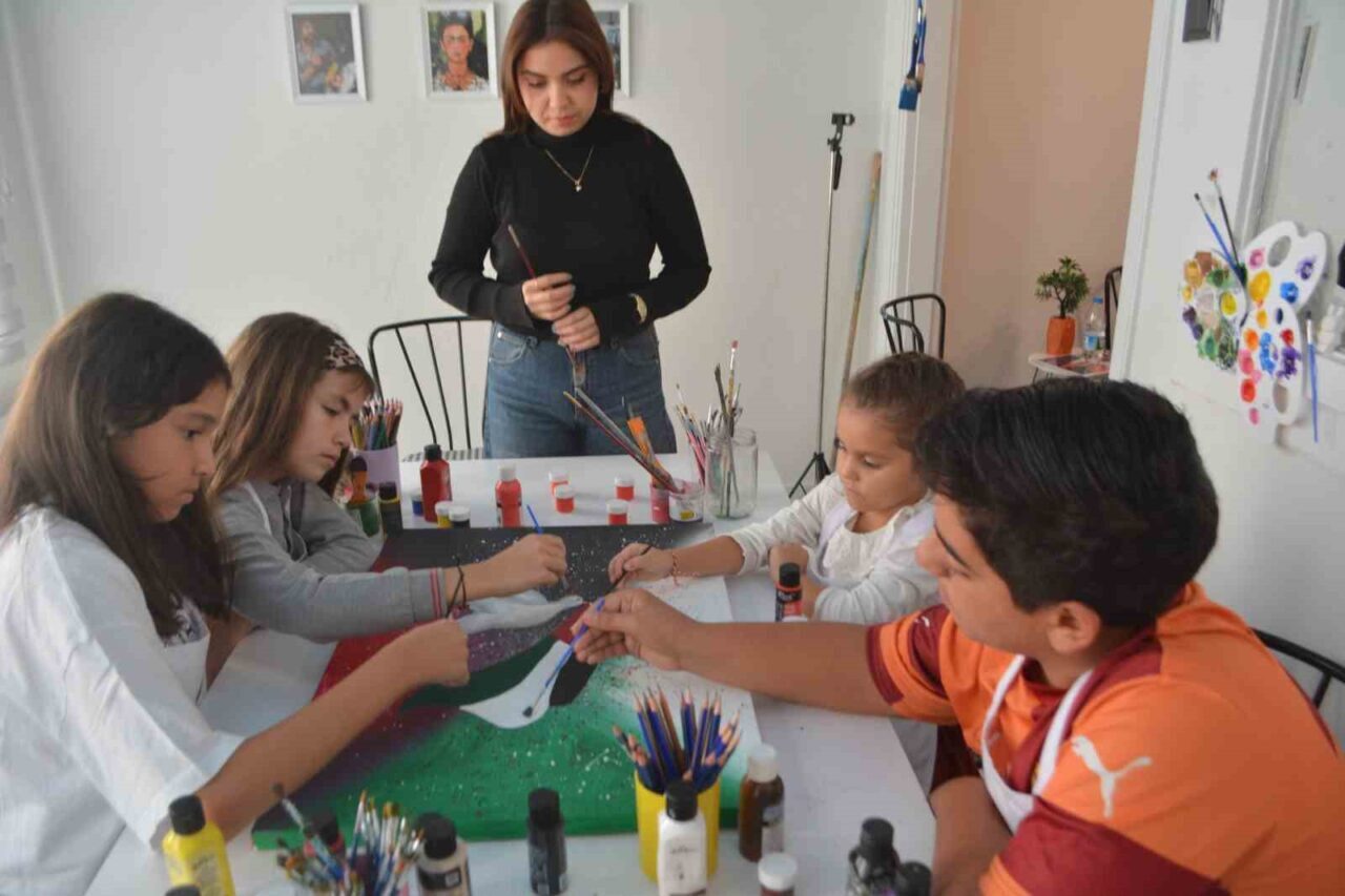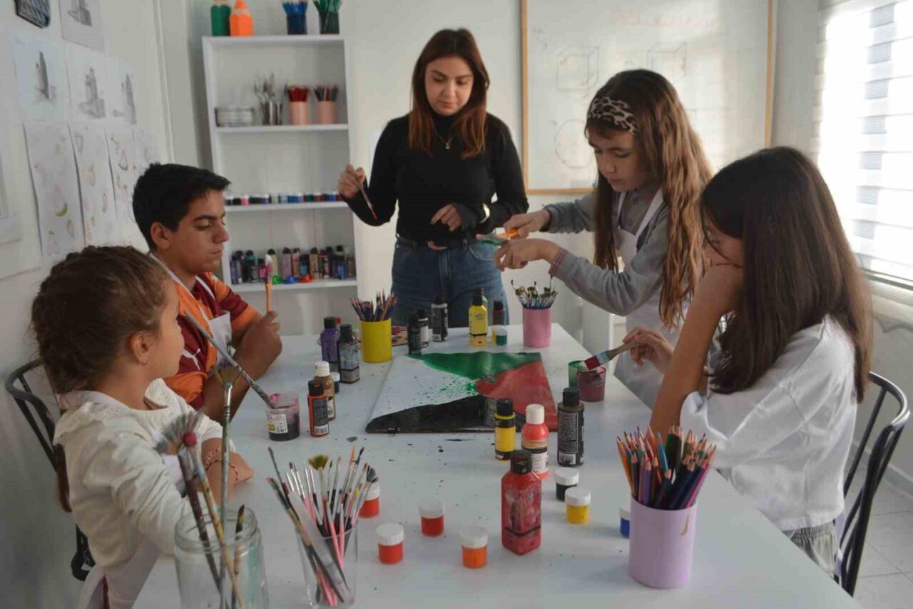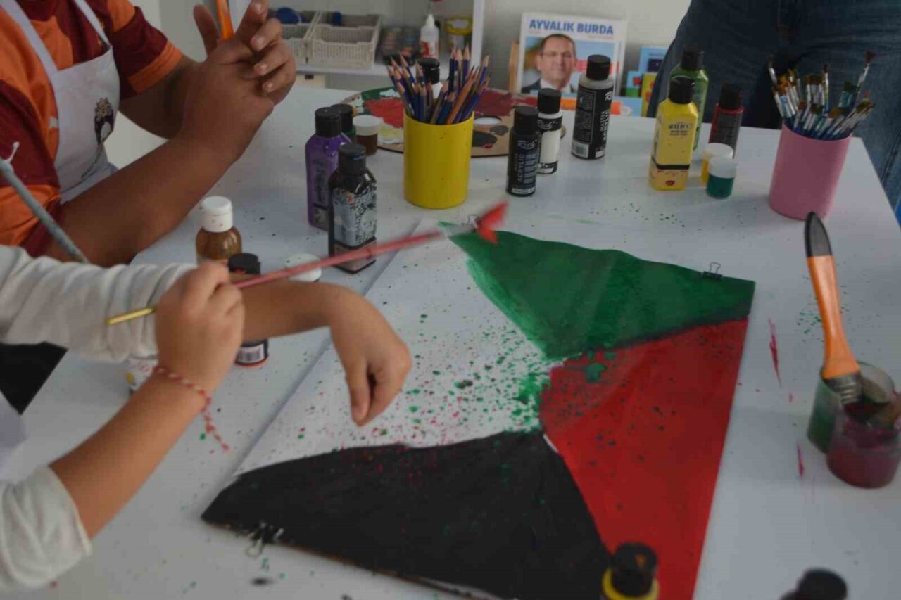 Ayvalık’ta bir özel atölyede resim yapan çocuklar, savaş sebebiyle hayatını kaybeden ve kaldırılan Gazzeli akranlarına yönelik anlamlı bir tablo ortaya koydu. 7 yaşındaki Nisa Çandır, 9 yaşındaki Derin Dalay, 11 yaşındaki Melek İşaret ve 13 yaşındaki Emirhan Karayağız, genç öğretmen Nursima Yıldız’dan resim yapmayı öğrenirken, Gazze’de hayatlarını kaybeden çocuklar için bir barış sembolü olan güvercinin ağızında Filistin bayrağını resmettiler. Bu eserleriyle dünyaya güçlü bir insanlık mesajı iletmiş oldular.