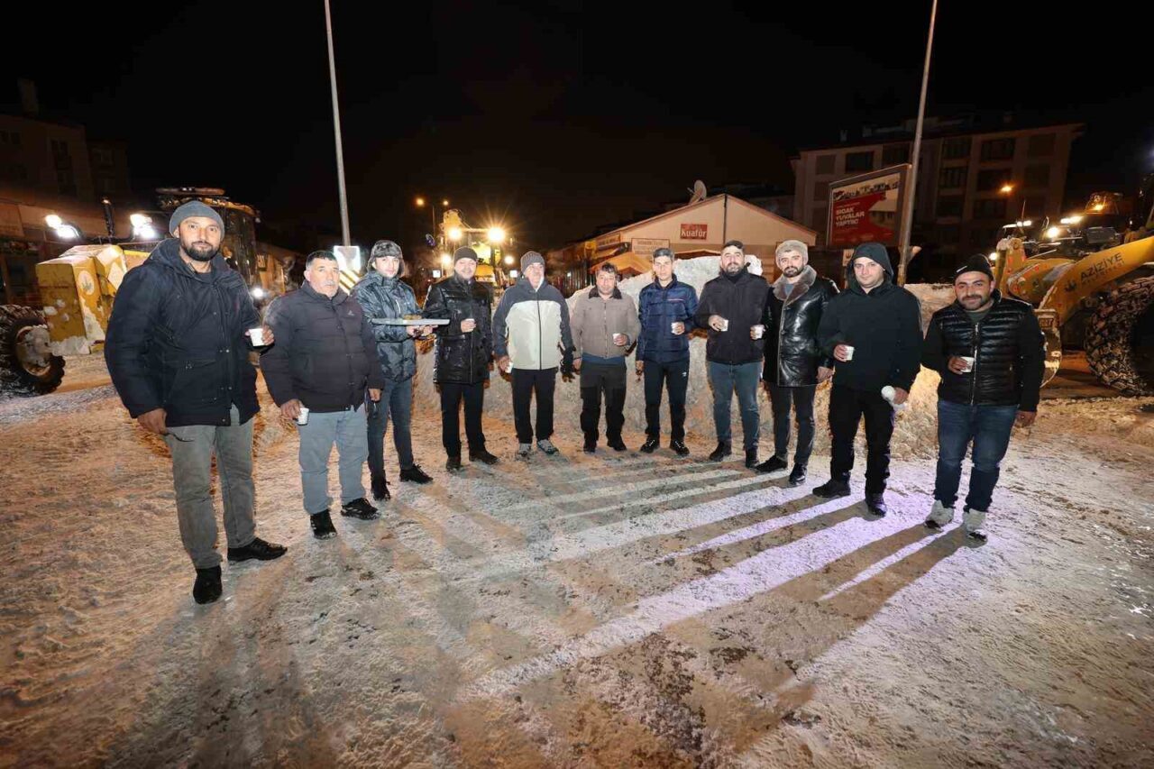 Aziziye Belediye Başkanı Emrullah Akpunar, sahada karla mücadele çalışması yürüten belediye işçilerine gece yarısı tatlı sürprizi yaptı.