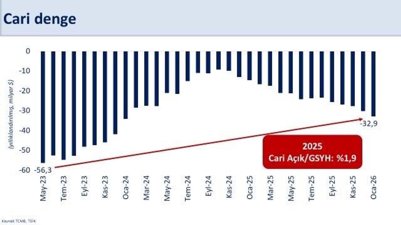 Hazine ve Maliye Bakanı Mehmet Şimşek, sosyal medya platformunda cari açık ile ilgili önemli açıklamalarda bulundu. Ocak ayında yıllık cari açığın 32,9 milyar dolar seviyesine ulaştığını belirten Şimşek, jeopolitik gerilimler ve enerji fiyatlarındaki yükselişin, 2026 yılı için cari açık tahminlerini etkileyebileceğini ifade etti. Güçlü makroekonomik temeller sayesinde bu artışın yönetilebilir olduğunu düşündüğünü aktaran Bakan, uygulanan ekonomi programının dış finansman ihtiyacını ve borçluluğu azalttığını, böylece ekonominin şoklara karşı dayanıklılığının arttığını vurguladı. Brüt dış borç stokunun GSYH'ye oranının 2025 yılı itibarıyla yüzde 32,6'ya gerileyeceğini belirten Şimşek, yüksek katma değerli üretimi destekleyen politikaların devam edeceğini söyledi.