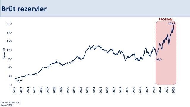 “Rezervlerimiz tarihi zirvesinde. Uyguladığımız program sayesinde brüt rezervler yaklaşık 107 milyar dolar artarak 205,2 milyar dolara ulaştı. Swap hariç net rezervlerdeki artış ise 139,3 milyar dolar oldu. Uluslararası standartlara göre rezerv yeterliliğini sağladık. Aynı zamanda, önemli bir şartlı yükümlülük olan 143 milyar dolar tutarındaki KKM’den çıkış sürecini de başarıyla tamamlıyoruz. Böylece döviz pozisyonunda toplam 280 milyar doları aşan iyileşme gerçekleşti. Güçlenen makro finansal istikrar, risk primimizin azalmasına ve ekonomimizin şoklara karşı daha dayanıklı hale gelmesine önemli katkı sağlıyor.”