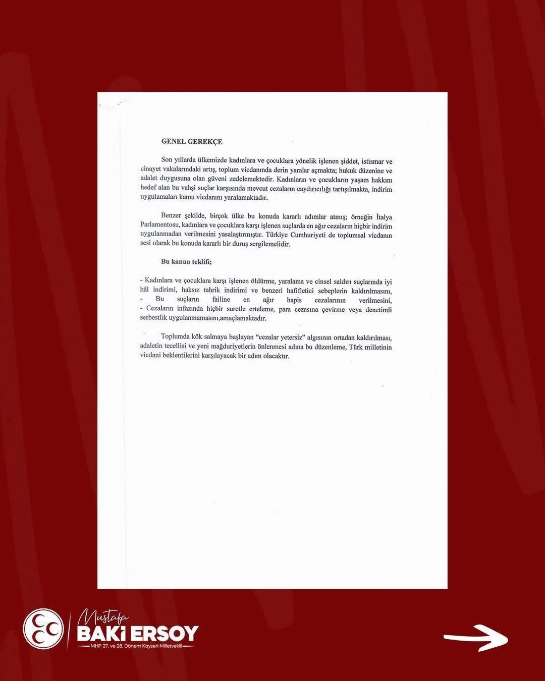 MHP Kayseri Milletvekili Baki Ersoy, Türkiye Büyük Millet Meclisi’ne önemli bir kanun teklifi sunarak, kadınlar ve çocuklara yönelik işlenen ağır suçlarla ilgili ceza indirimlerinin kaldırılmasını talep etti.